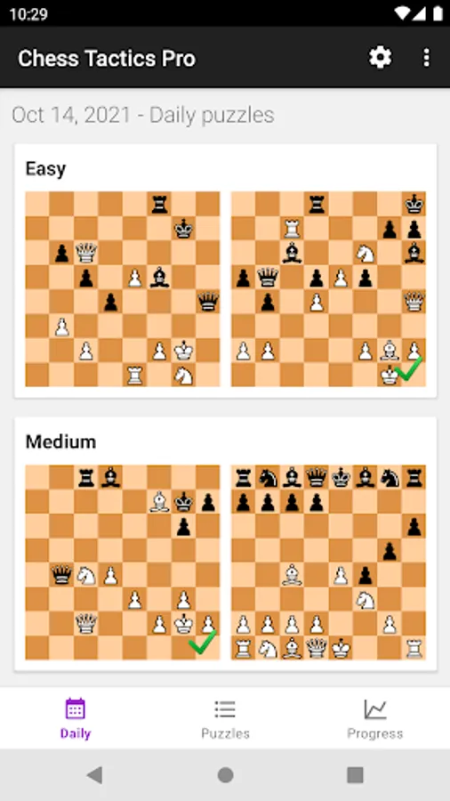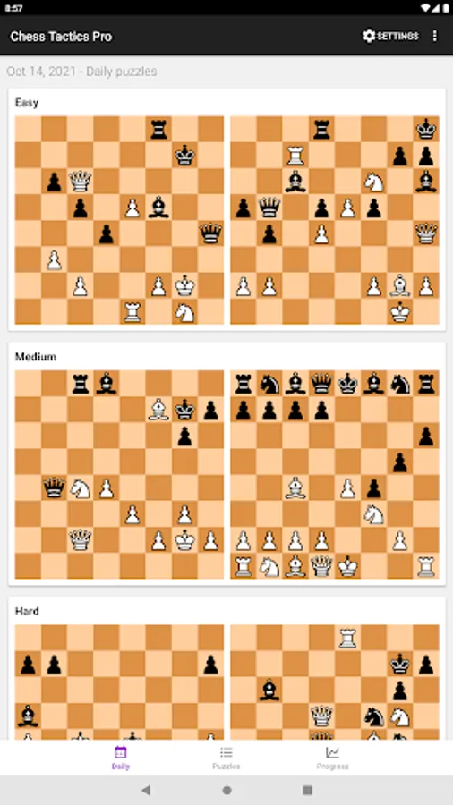 All puzzles are of a high quality and are guaranteed to have a unique solution. The difficulty ranges from beginner to advanced (2000+ Elo).
