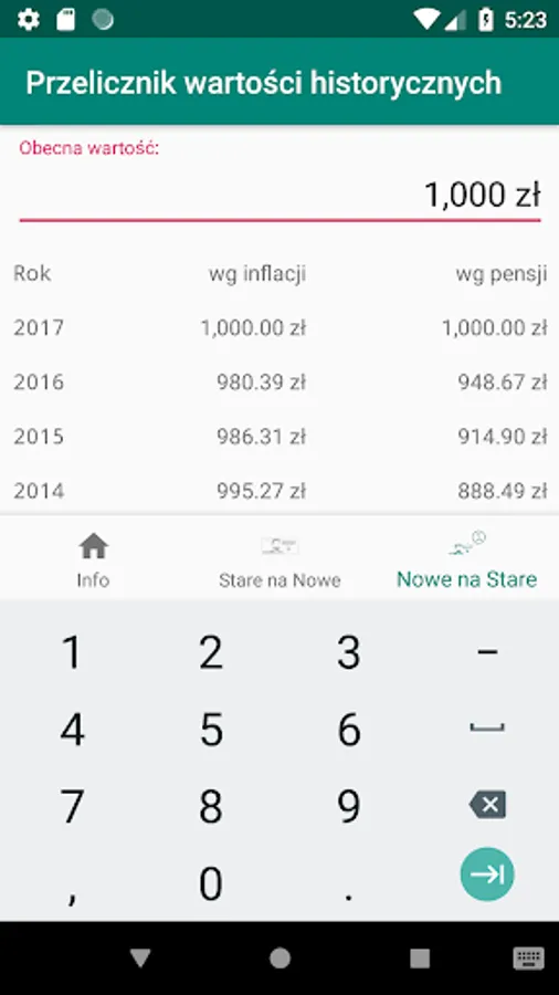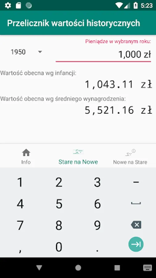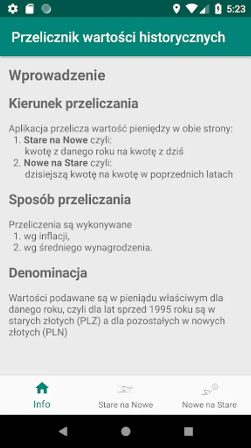 The application calculates the value of Polish zlotys according to inflation and the average salary.
