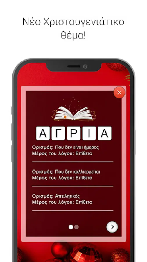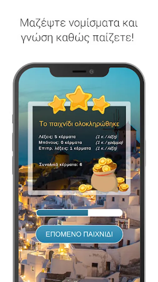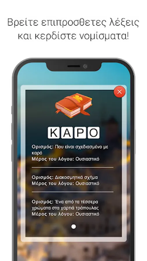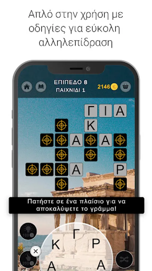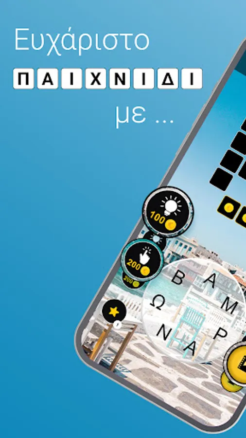 Have fun spending your free time solving word puzzles with the letters on the wheel. Improve your vocabulary, train your mind and learn new words using our vocabulary. Watch backgrounds with beautiful Greek landscapes that change with each level as you listen to relaxing background music.
