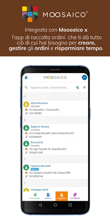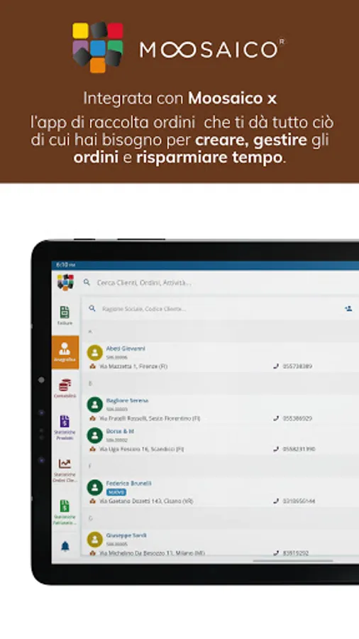 Thanks to the integration with the Moosaico X® order collection app, you can access the personal area to place orders and operate quickly and flexibly, with all information always available even in the absence of connectivity.