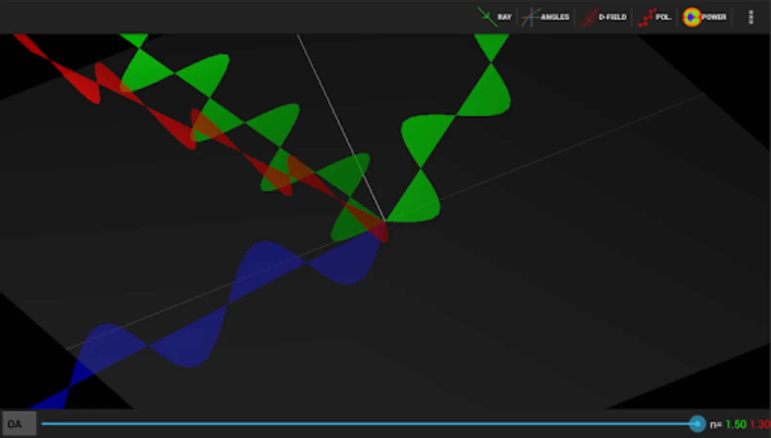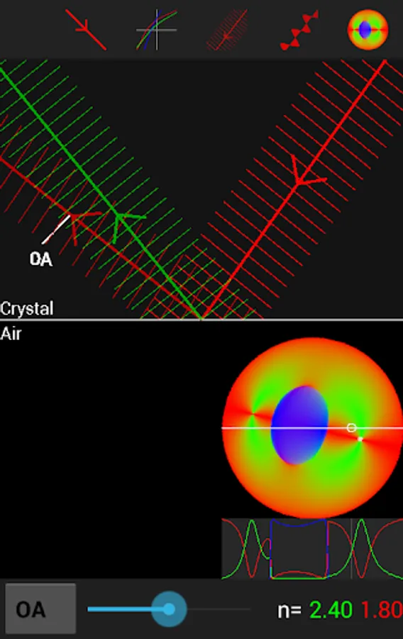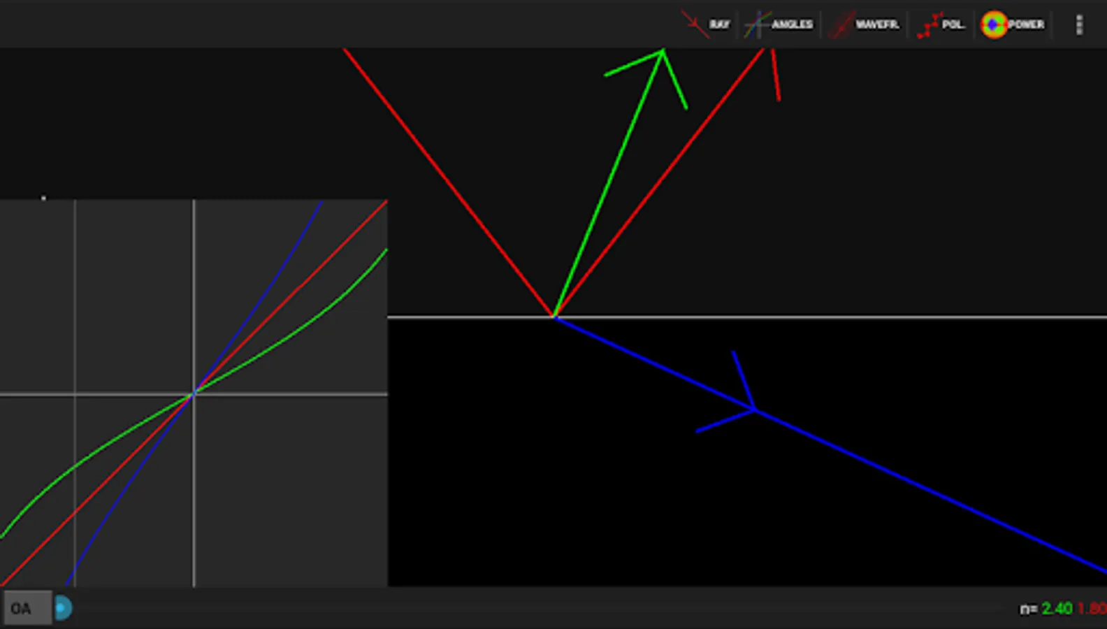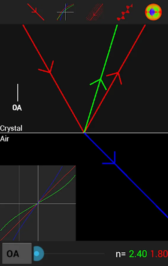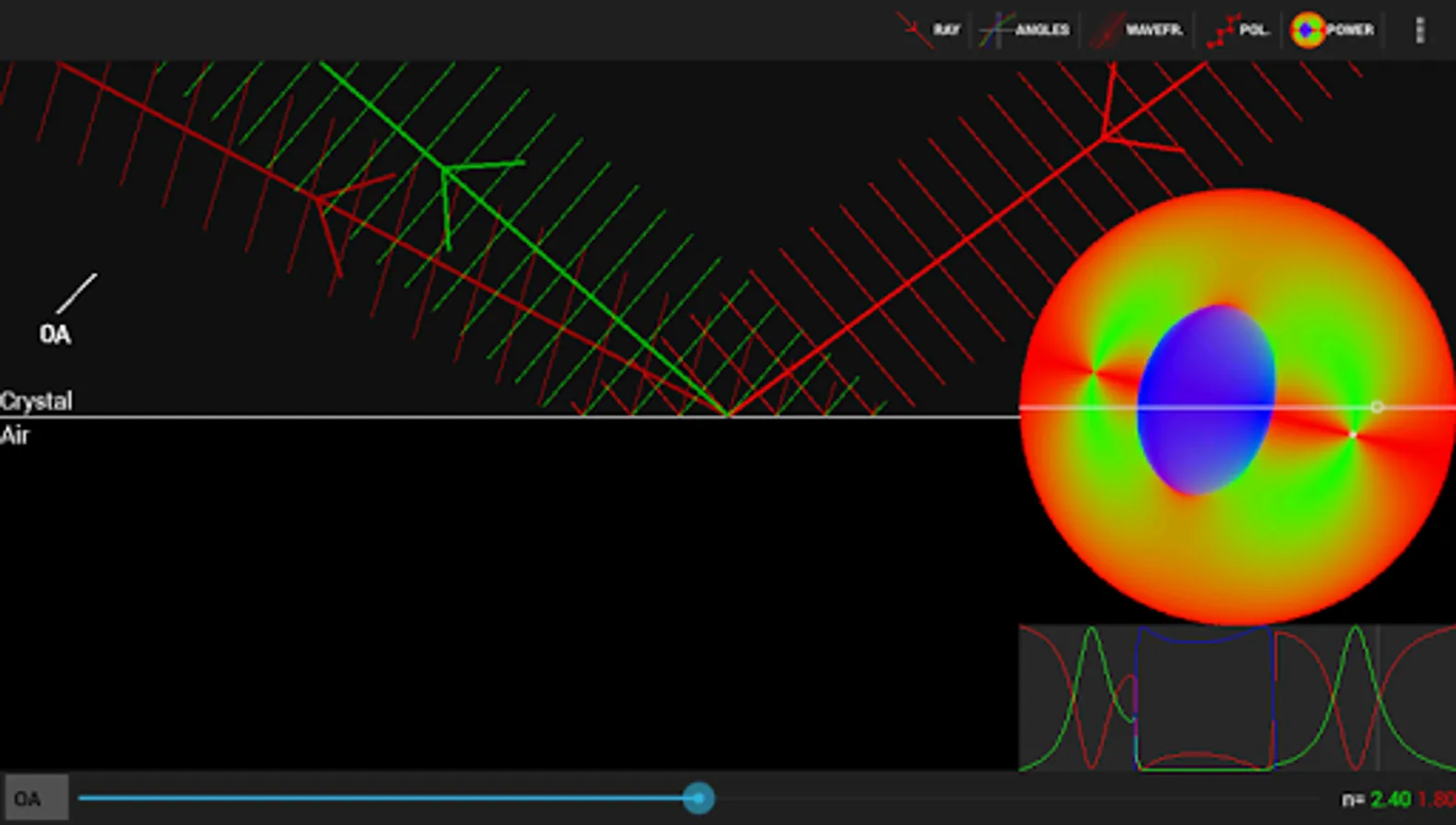 Shows a light ray within a birifringent crystal and reflection and transmission at the surface towards air.