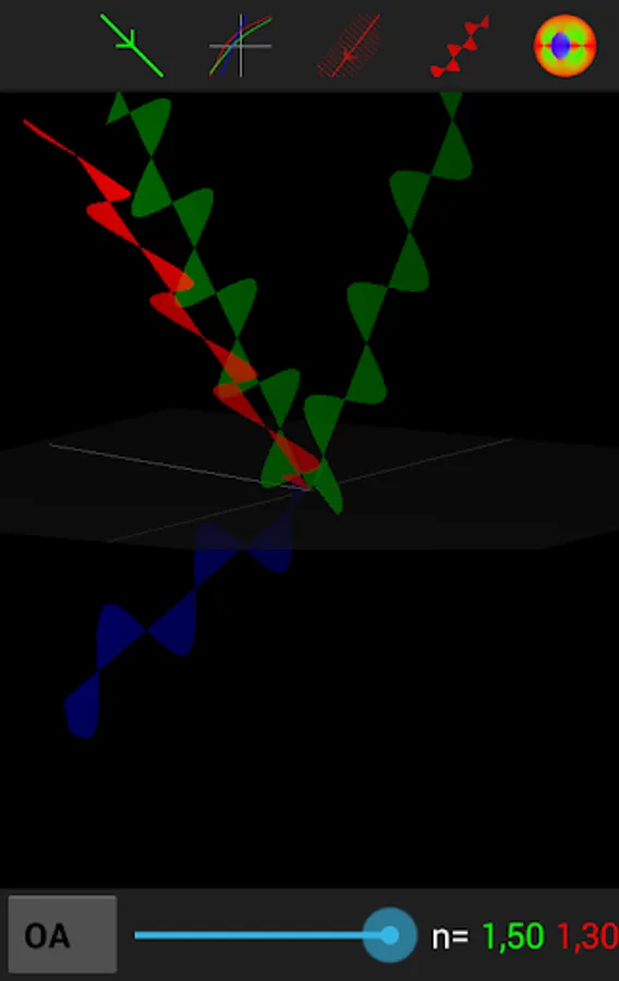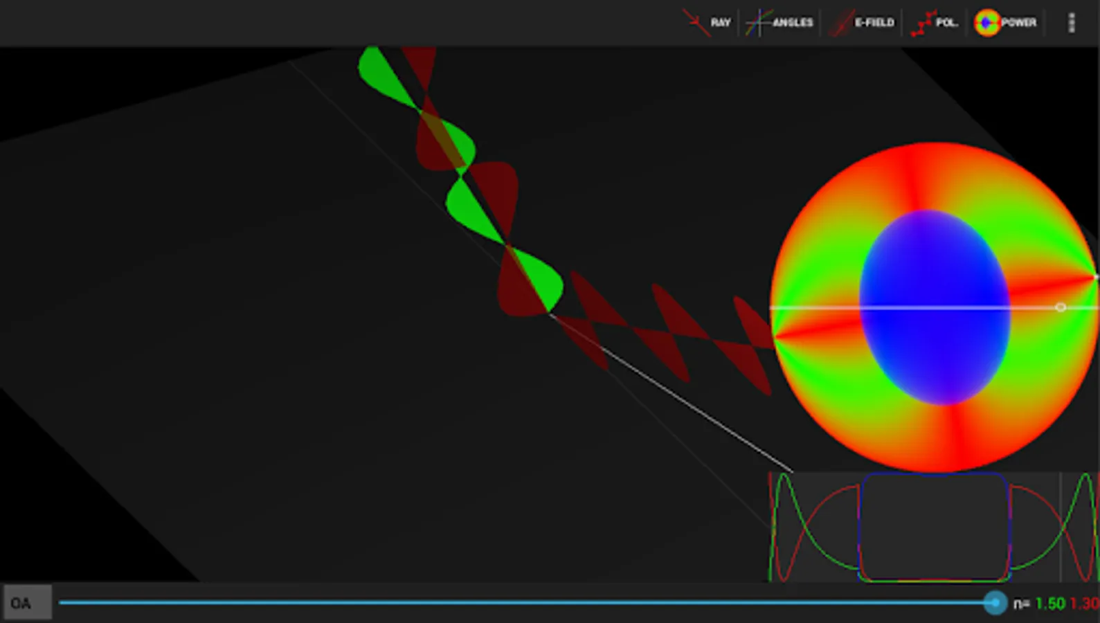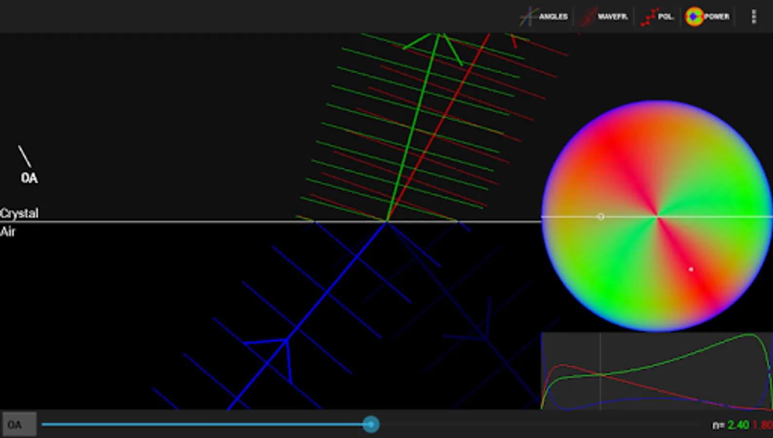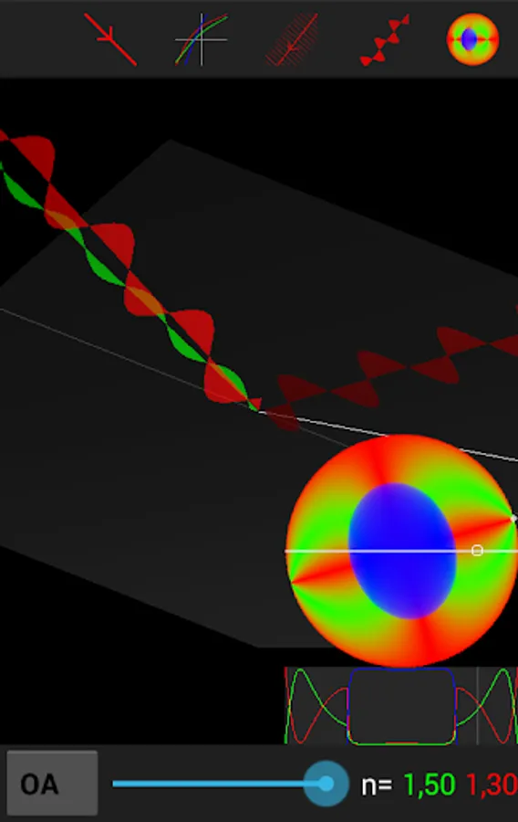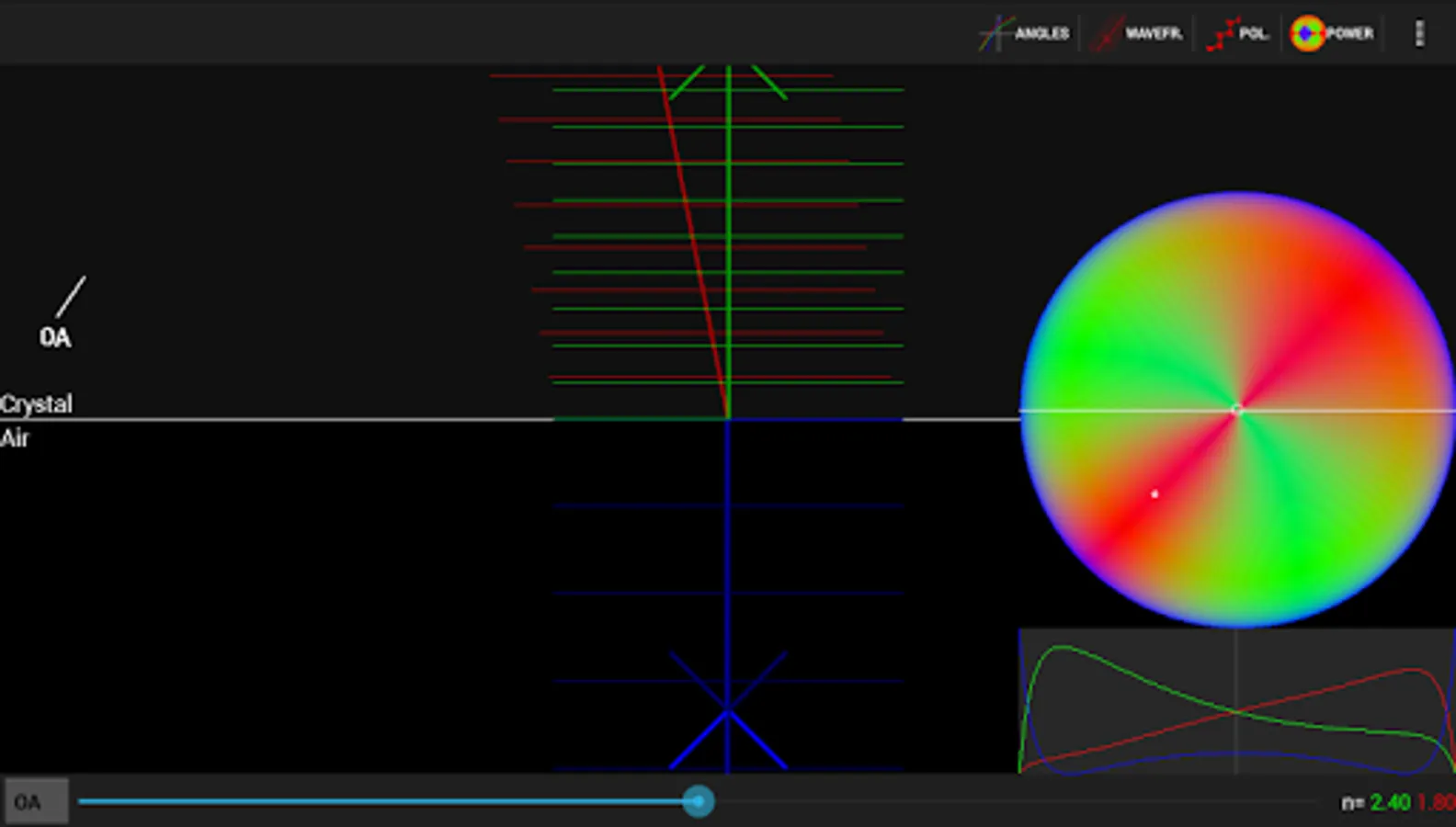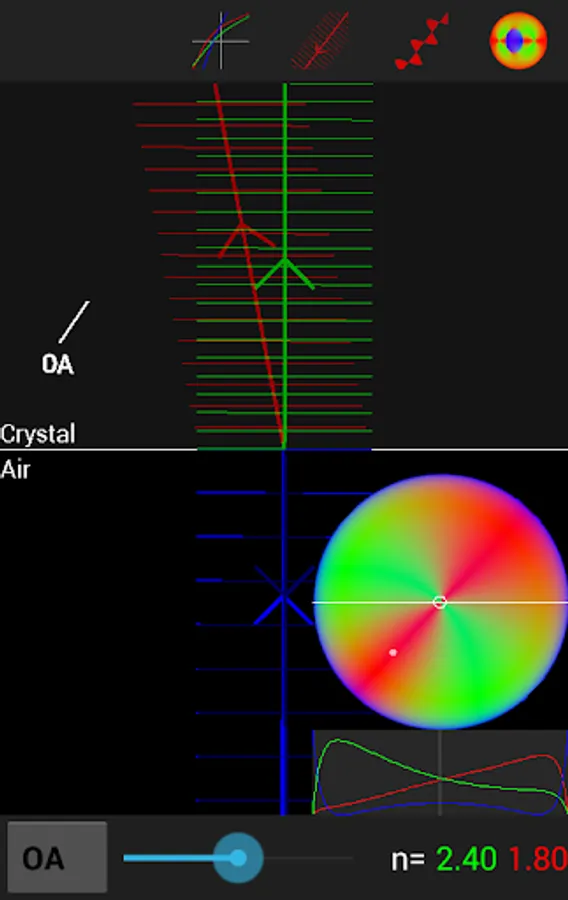 Shows a light ray within a birifringent crystal and reflection and transmission at the surface towards air.
