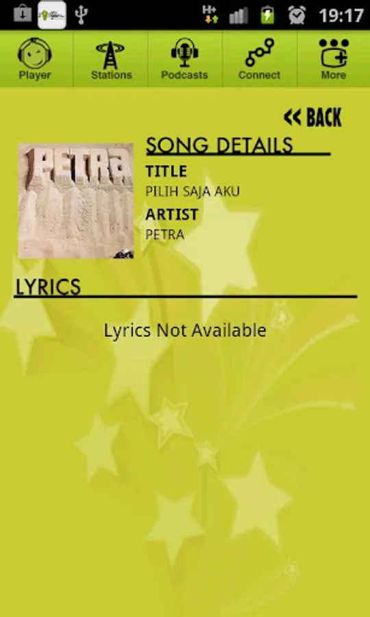 To access the lyrics view, tap on the album art when the "plus" icon is shown on the corner of the album art. If there is no "plus" icon, it means that the meta information for the current song is not available