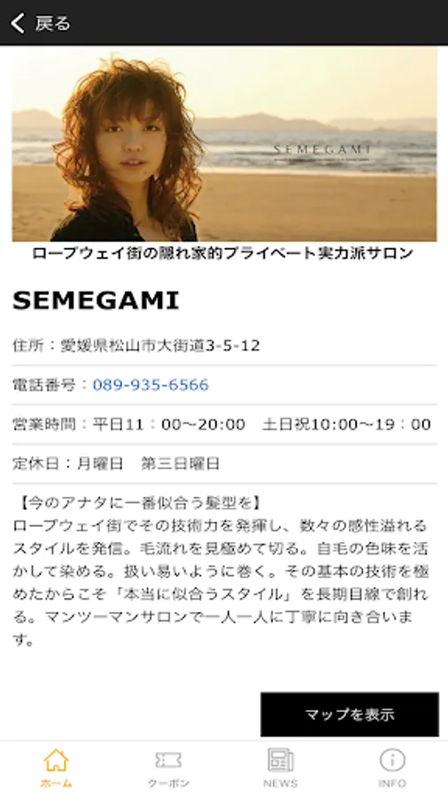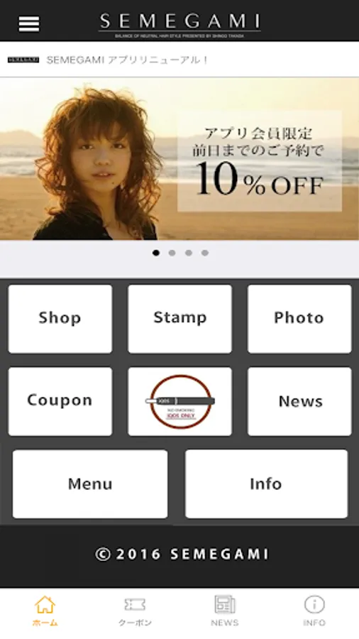 This is the official app of SEMEGAMI, a hair salon in Matsuyama City, Ehime Prefecture. We will continue to deliver the latest information. In the app, you can browse the latest information and menu of the shop!