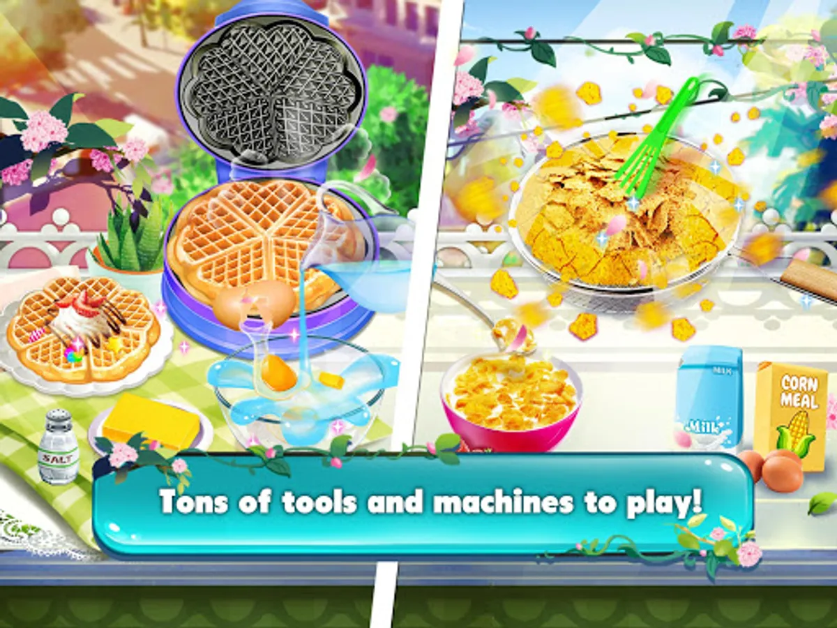 -Make yummy breakfast for corn flakes, omellette, fried eggs & bacon, waffles and chocolate croissant