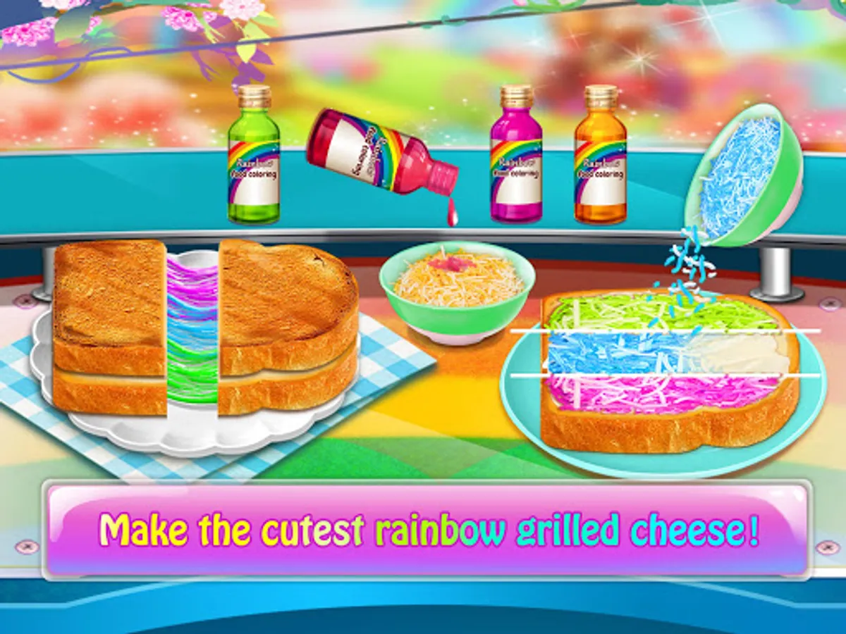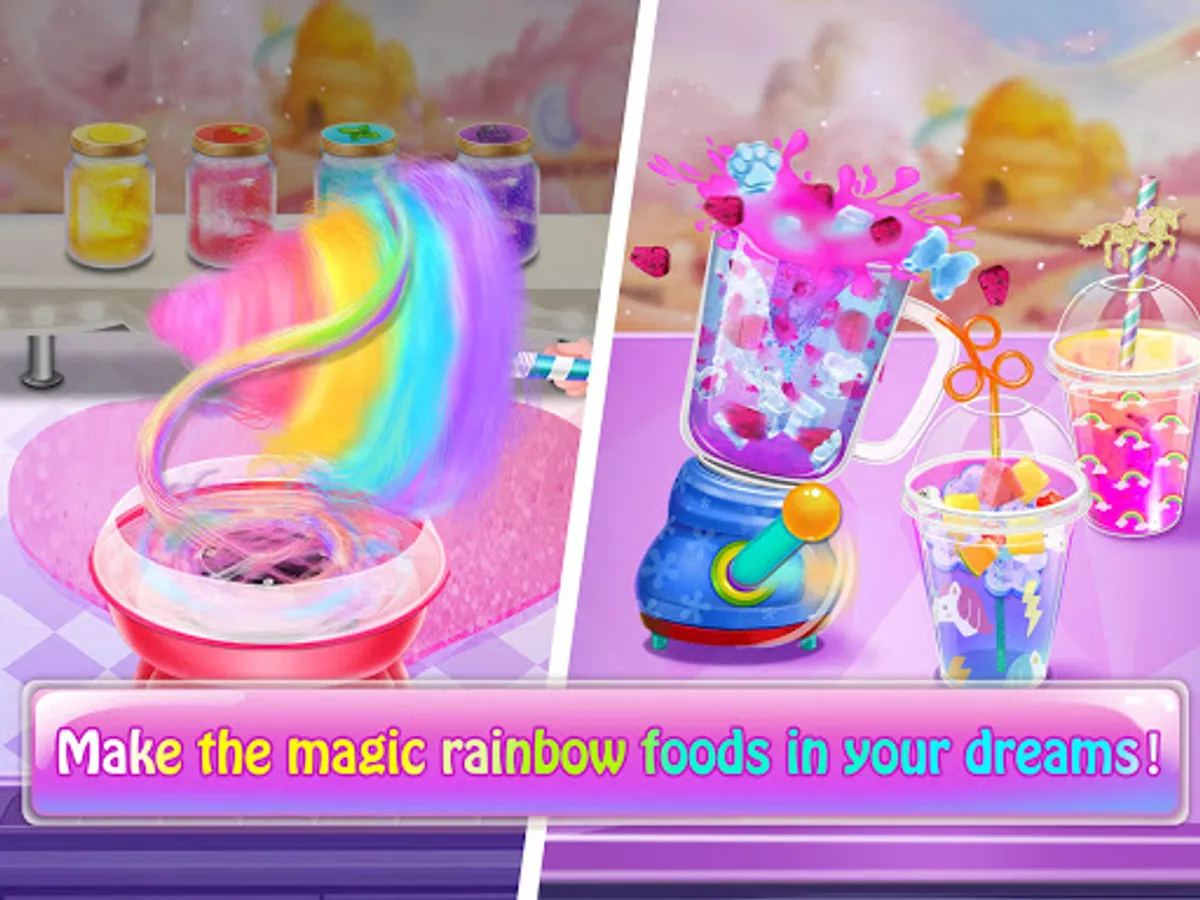 Go travel to the rainbow magic land to explore yummy rainbow unicorn foods! Such as rainbow grilled cheese, unicorn cotton candy, ice cream rolls, marshmallow wands, and the fantastic rainbow latte!