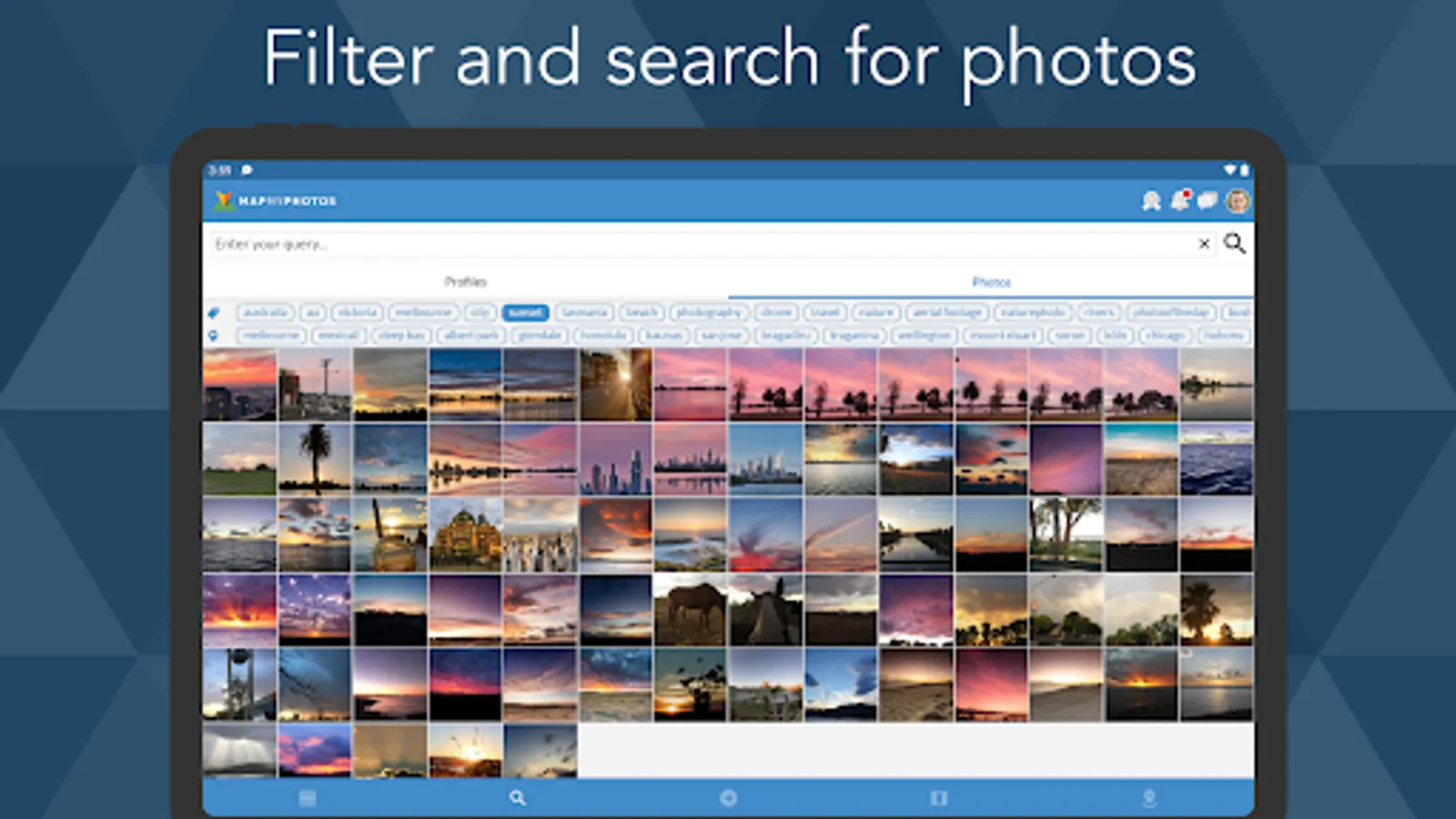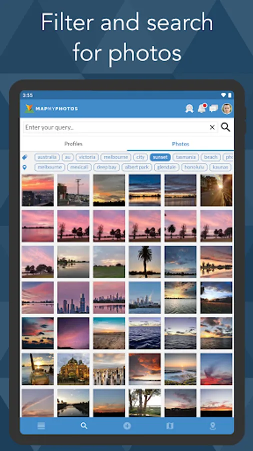 Search the entire world-wide collection of public photos. The MapMyPhotos photo search is super powerful, using AI to find matches by keywords such as "sunrise" or "rainbow".