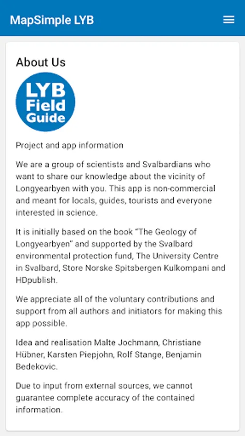 We are a group of scientists and Svalbardians who want to share our knowledge about the vicinity of Longyearbyen with you. This app is non-commercial and meant for locals, guides, tourists and everyone interested in science.