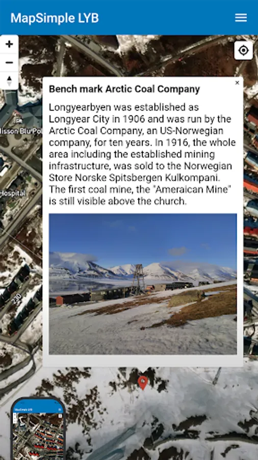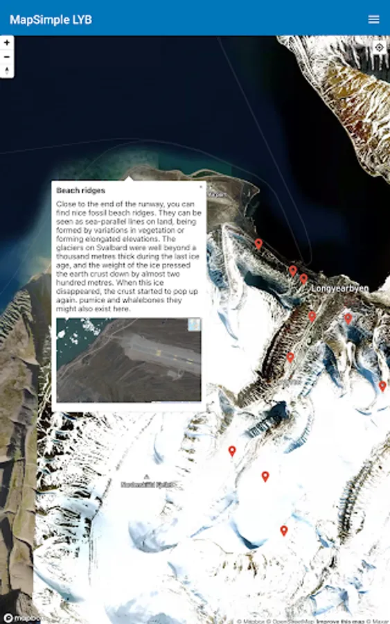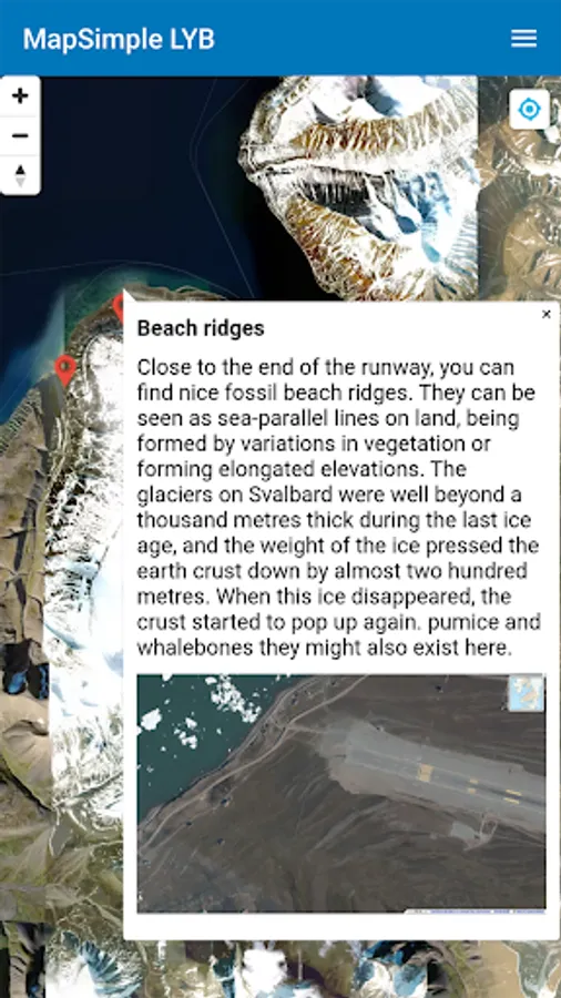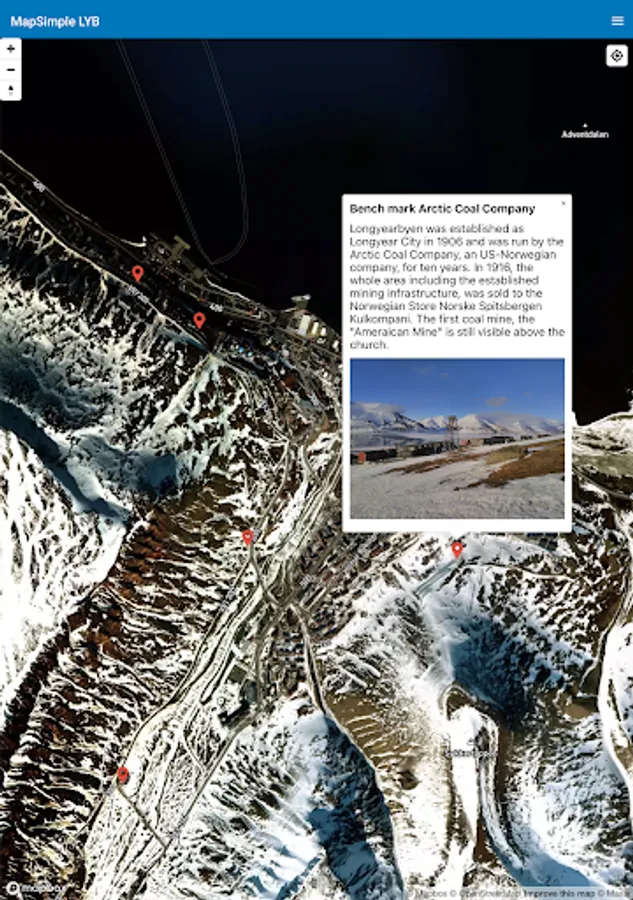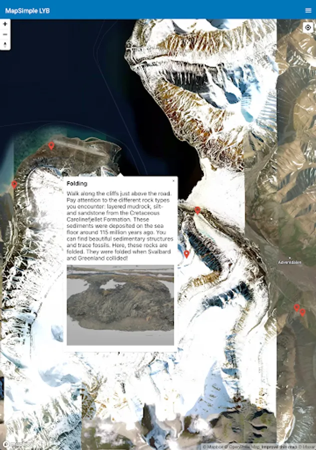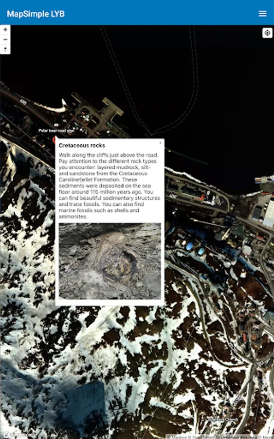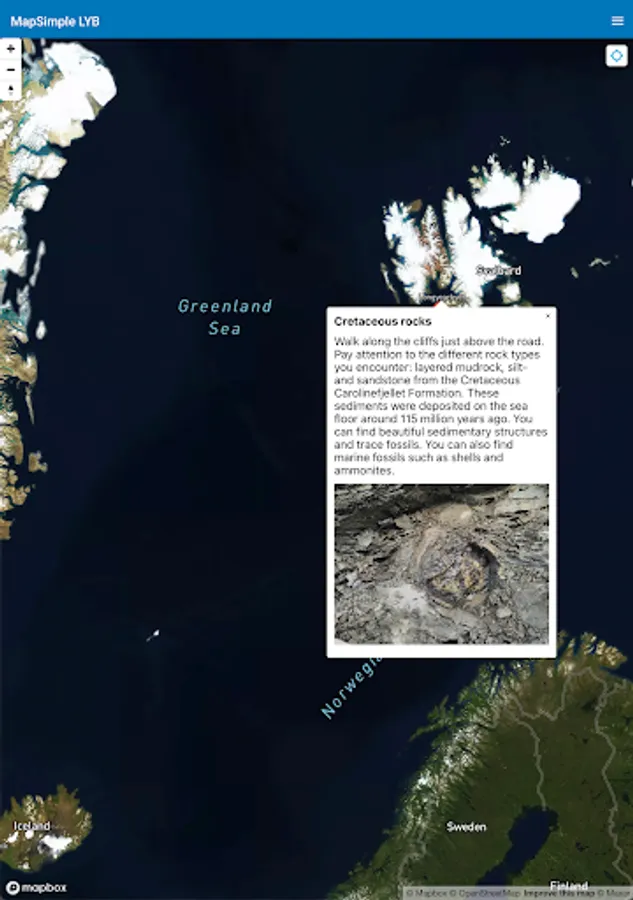 The contents are initially based on the book “The Geology of Longyearbyen”, supported by the Svalbard environmental protection fund, The University Centre in Svalbard, Store Norske Spitsbergen Kulkompani. The software is a MapSimple development by JM-software and HDpublish.