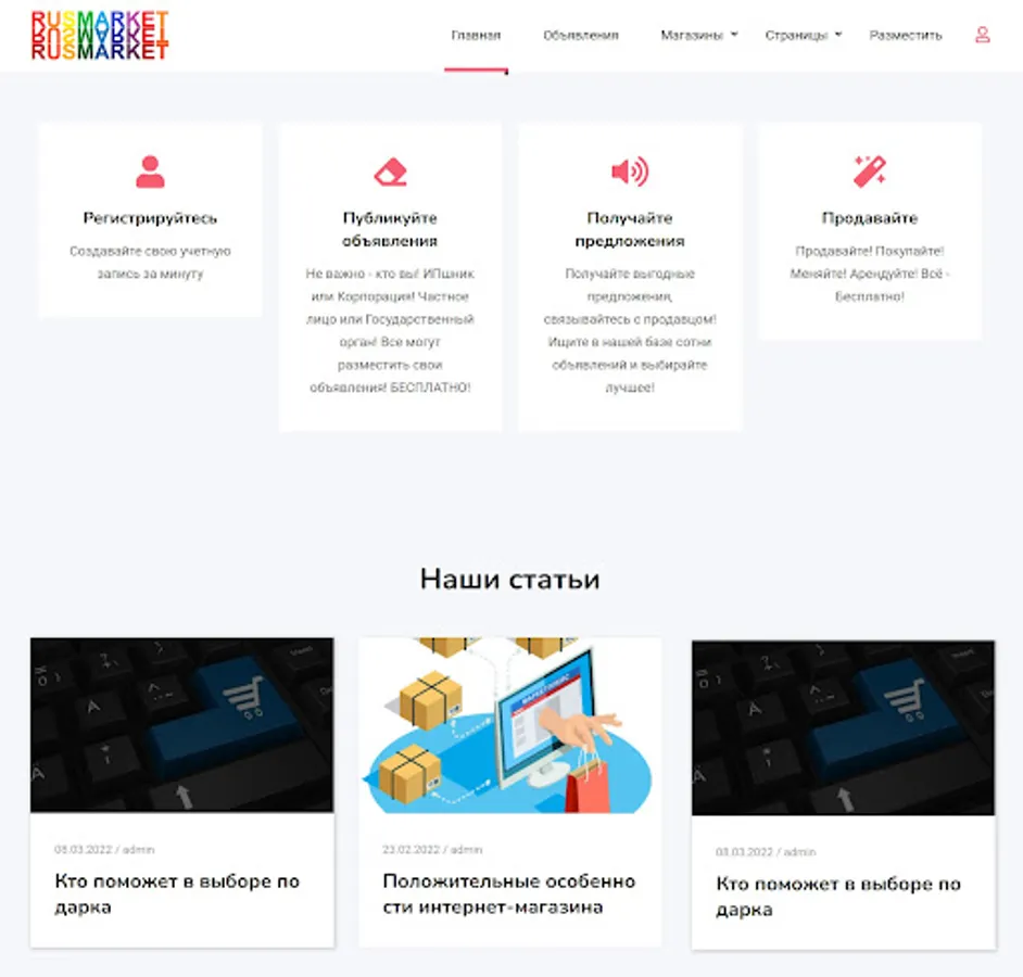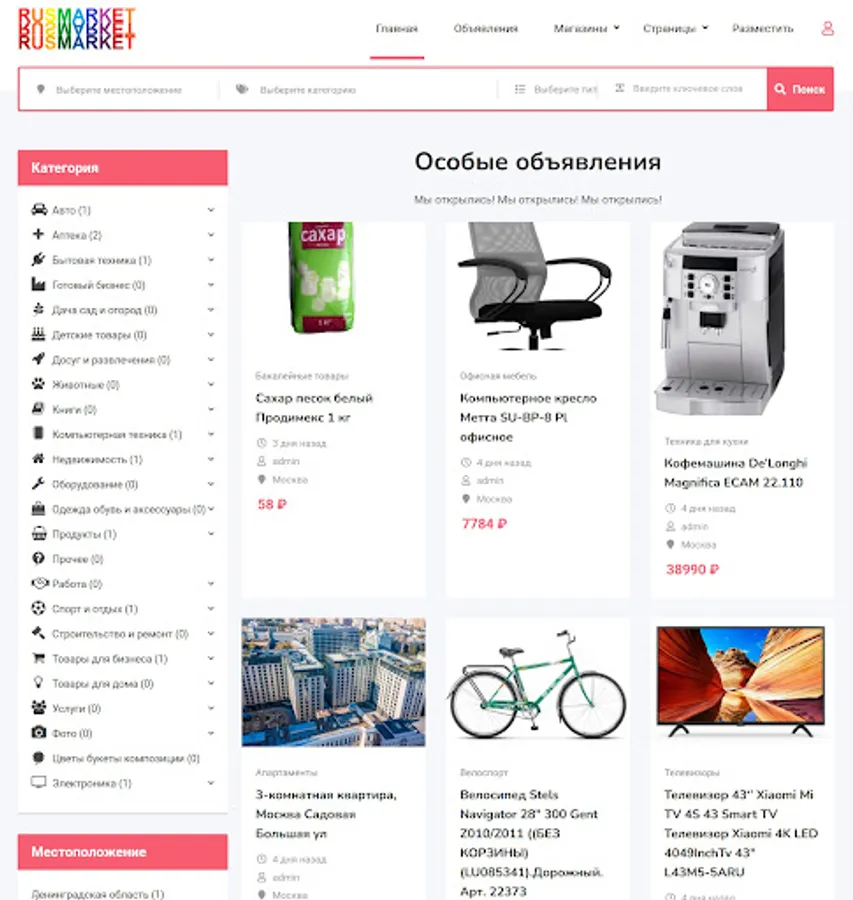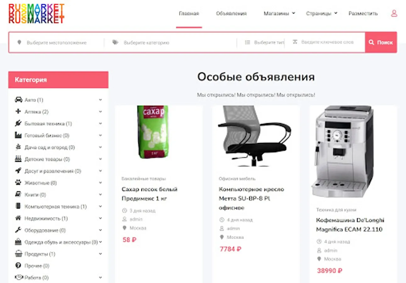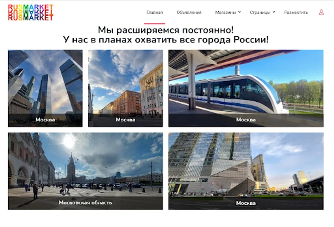 Buy and sell for the best price. Thousands of people come to our free marketplace RUSMARKET every day to find a used car or spare parts for foreign cars, pet supplies or household goods, as well as buy, exchange or sell an apartment in Moscow or another Russian city. You can negotiate a discount with all participants in the transaction, and new products on our site are often sold cheaper than in a regular store.