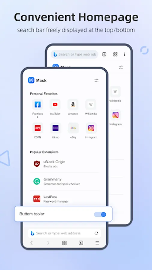 4. Mask Browser supports personalized customization, and you can set the search bar at the top or bottom. It is more in line with the user habits of single handed mobile phone operation than Kiwi Browser, and you don't need to change your usage habits.