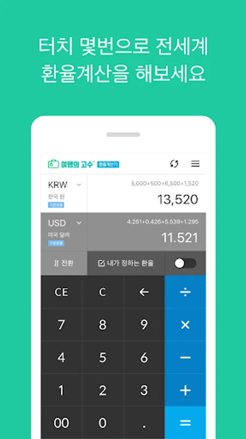 When the Internet is not available, the previously updated exchange rate is imported and the exchange rate is calculated stably. If the Internet is available, the user always gets the latest exchange rate information through the exchange rate update button and updates it in real time. You no longer have to search and find out on the portal site!