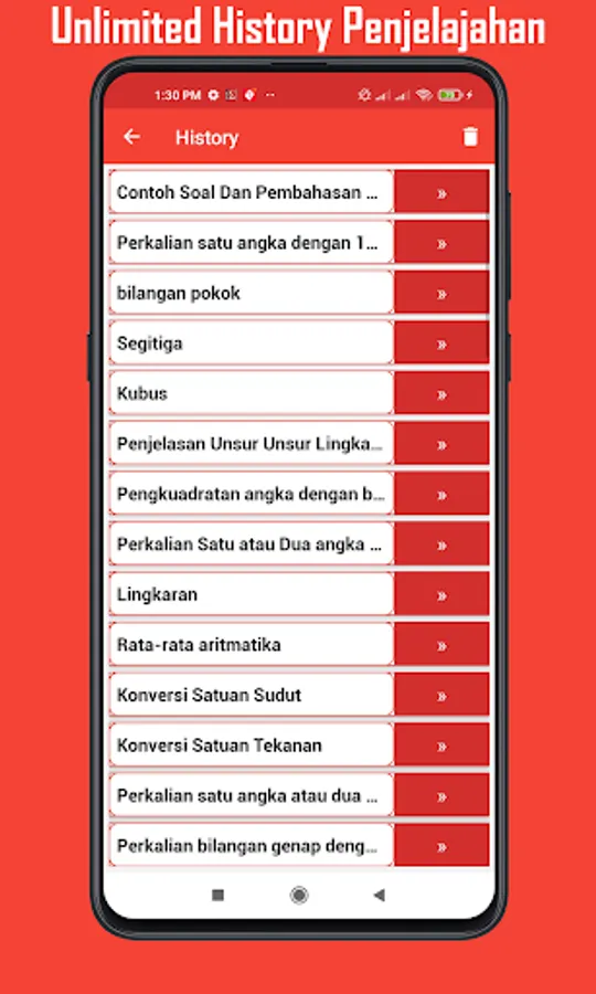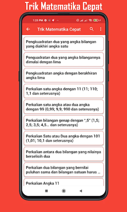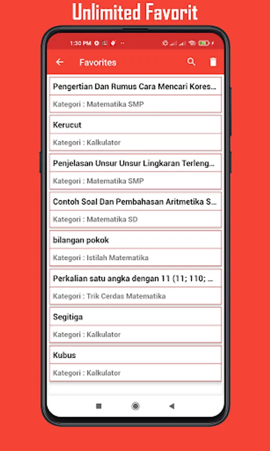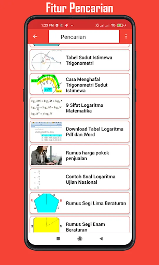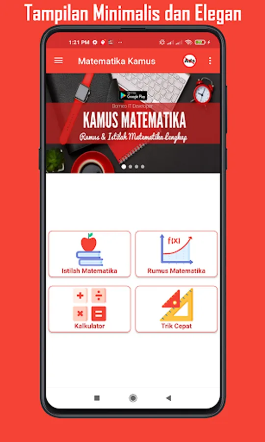This application is equipped with a Dictionary of Mathematical Terms and accompanied by Mathematical Formulas from the elementary, junior high, and high school levels. In addition there are also Quick Math Tricks, Calculators, and Conversions to make it easier for you to speed up calculations. The images in the application are expected to make it easier for you to understand the material presented.