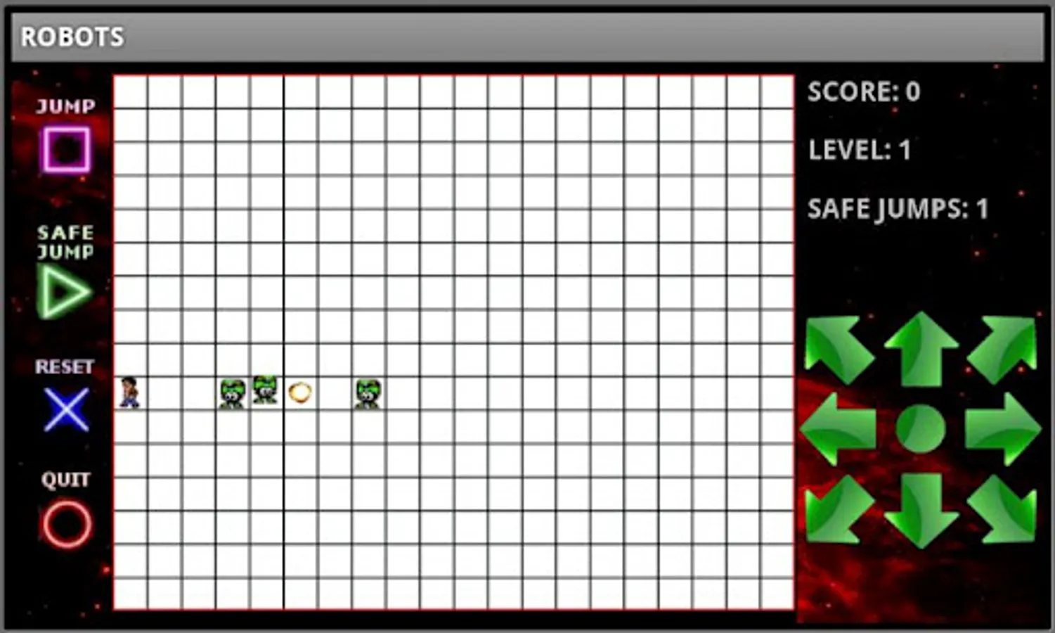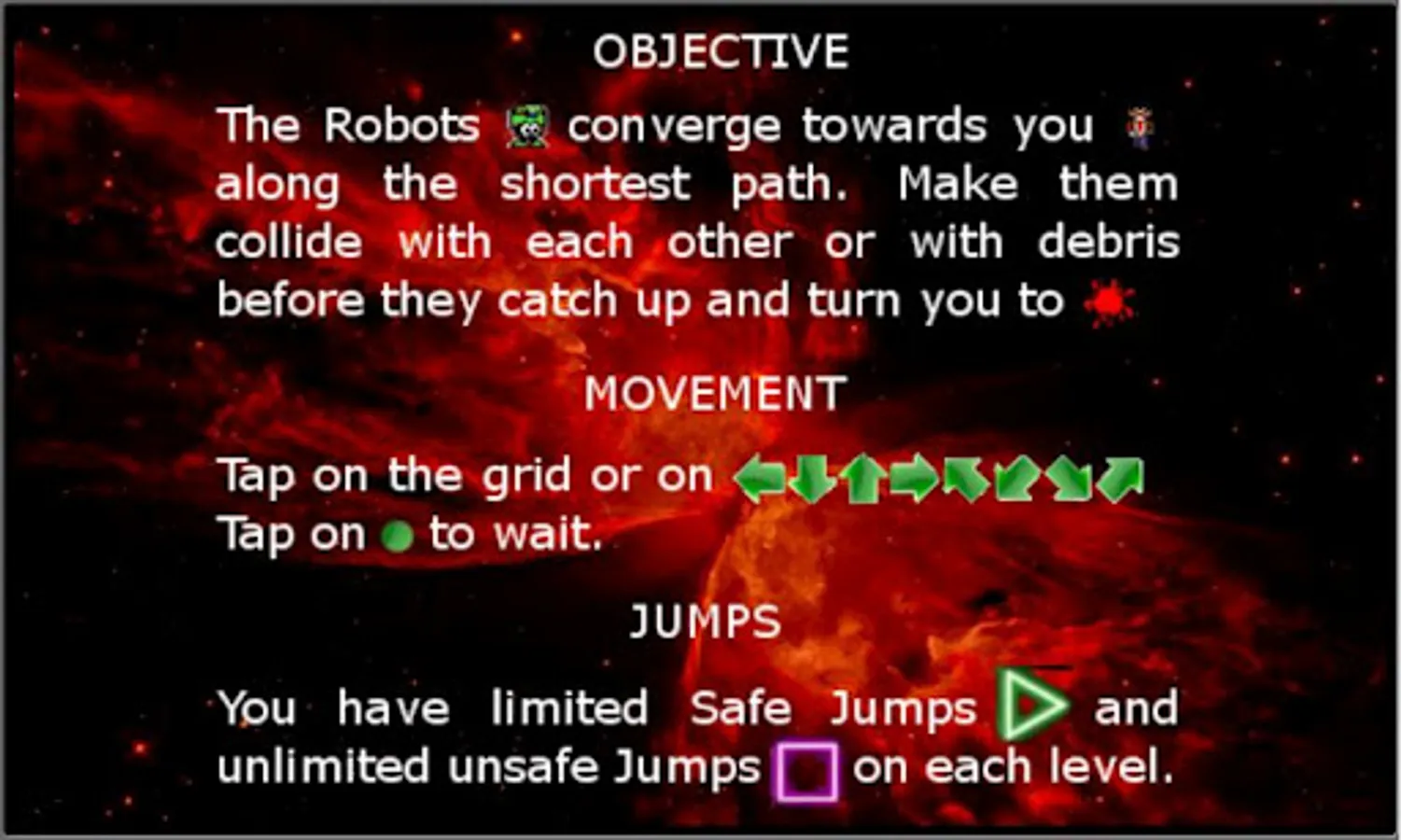 The Robots are out to get you! Make them collide and blow up as they move towards you, before they catch up and turn you to squishy pulp. Cornered? jump out of the way, but you've only got limited safe jumps per level!