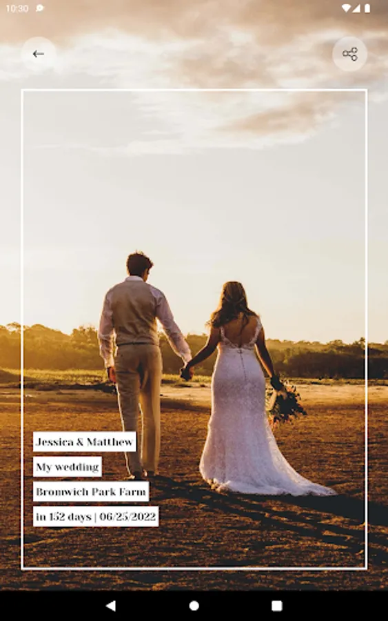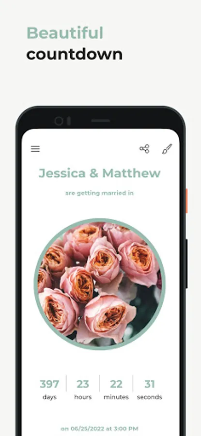 Count down the days until your wedding and share it with your friends and family. The built-in sharing lets you instantly share a beautiful snapshot of your countdown with your loved ones.