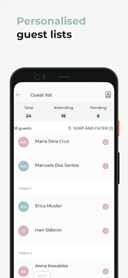 Curate your personal guest list in the app. Tag your guests by groups and tables and keep track of the RSVP state of all your guests.