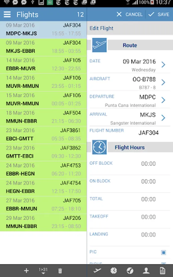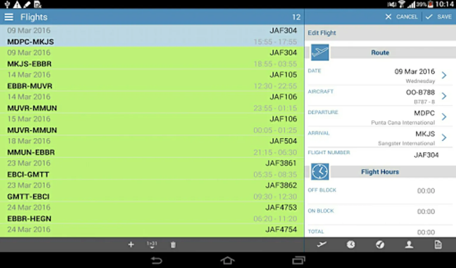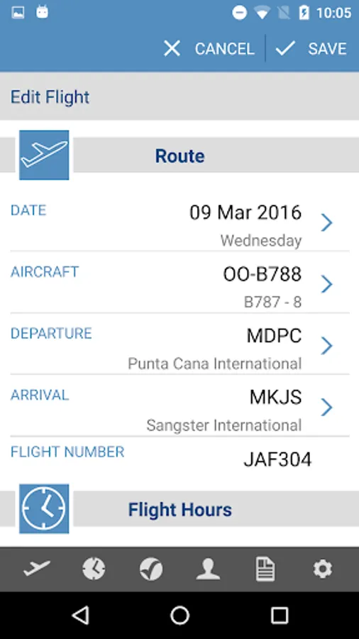 Use the Android app to complete the flight records with actual flight times, aircraft tail, PF and/or crew names onboard the aircraft, and return the completed records back to the desktop through mccCLOUD sync.
