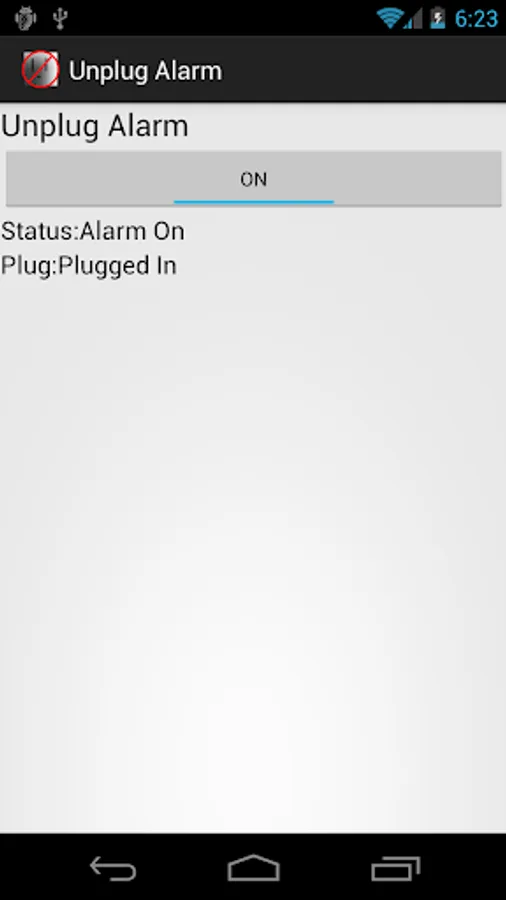 When turned ON it will sound a loud annoying siren when the phone is unplugged from its charger, until the alarm is turned off. When enabled and minimized, an alert is shown as a reminder that the alarm is on.