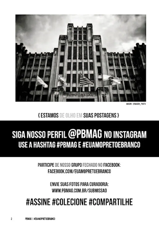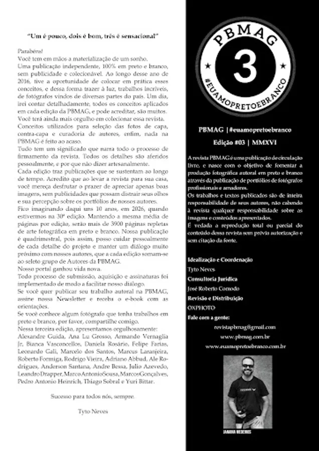 PBMAG Magazine is an independent publication that presents unique content in the photographic market. It is the only Brazilian magazine 100% in black and white and without advertising.