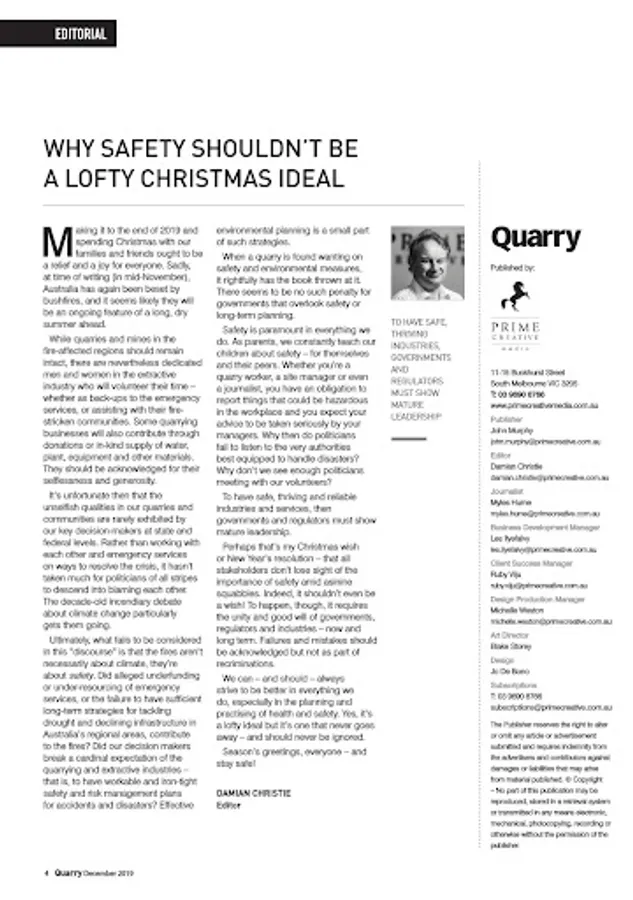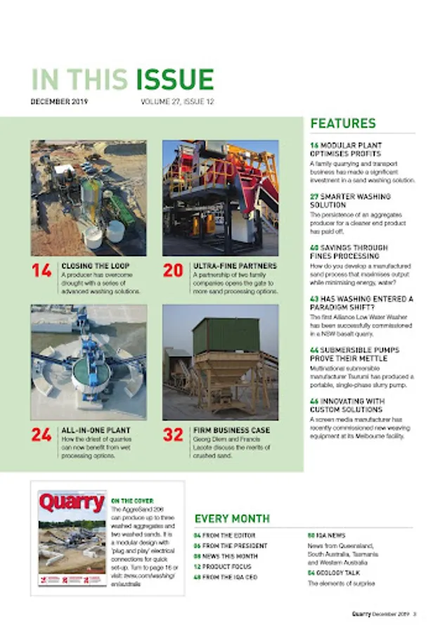 Quarry is the official publication of the Institute of Quarrying Australia. It is also Australia’s only publication dedicated to the promotion of the discipline and science of the quarrying, extractive and construction materials industries. The magazine was first launched in 1984.