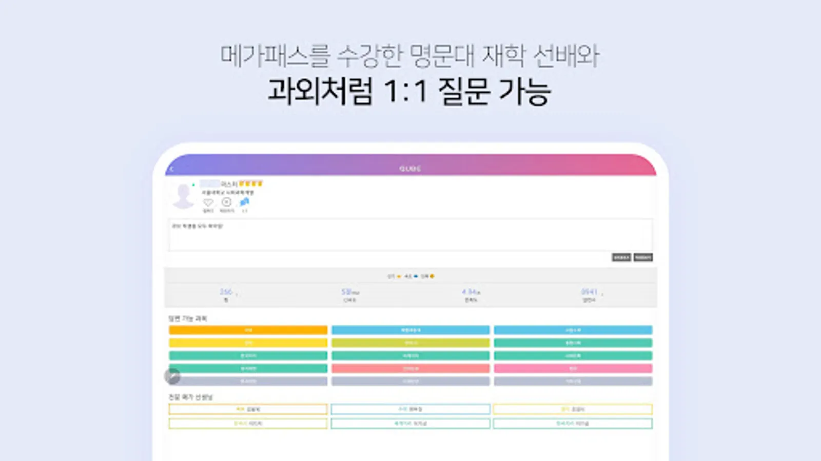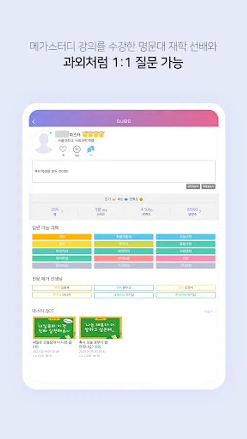 Answer master composed of students from prestigious universities such as SKY, Dentistry, and KAIST from Megastudy! It provides differentiated answers such as Korean language, mathematics, English, Korean history, social studies, science, essay, and second foreign language learning questions, mega teacher curriculum, learning method by grade, and college entrance counseling.