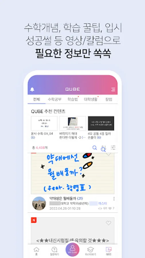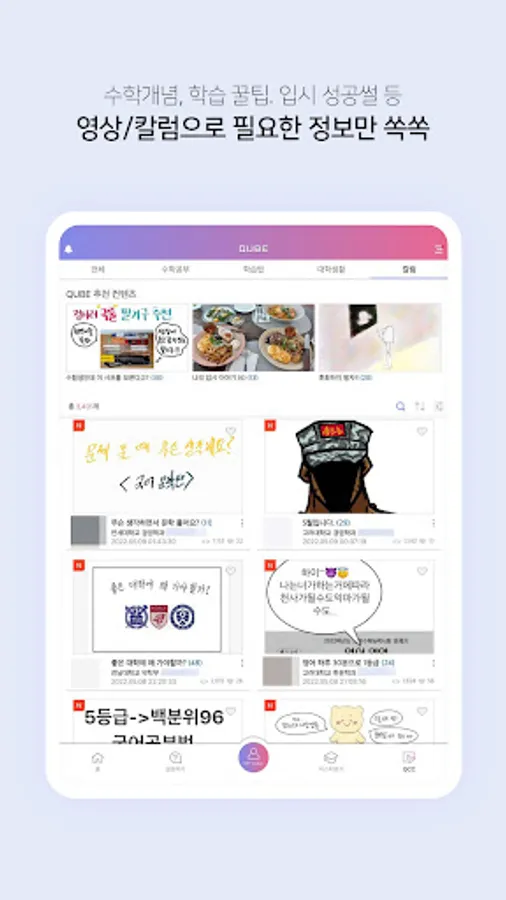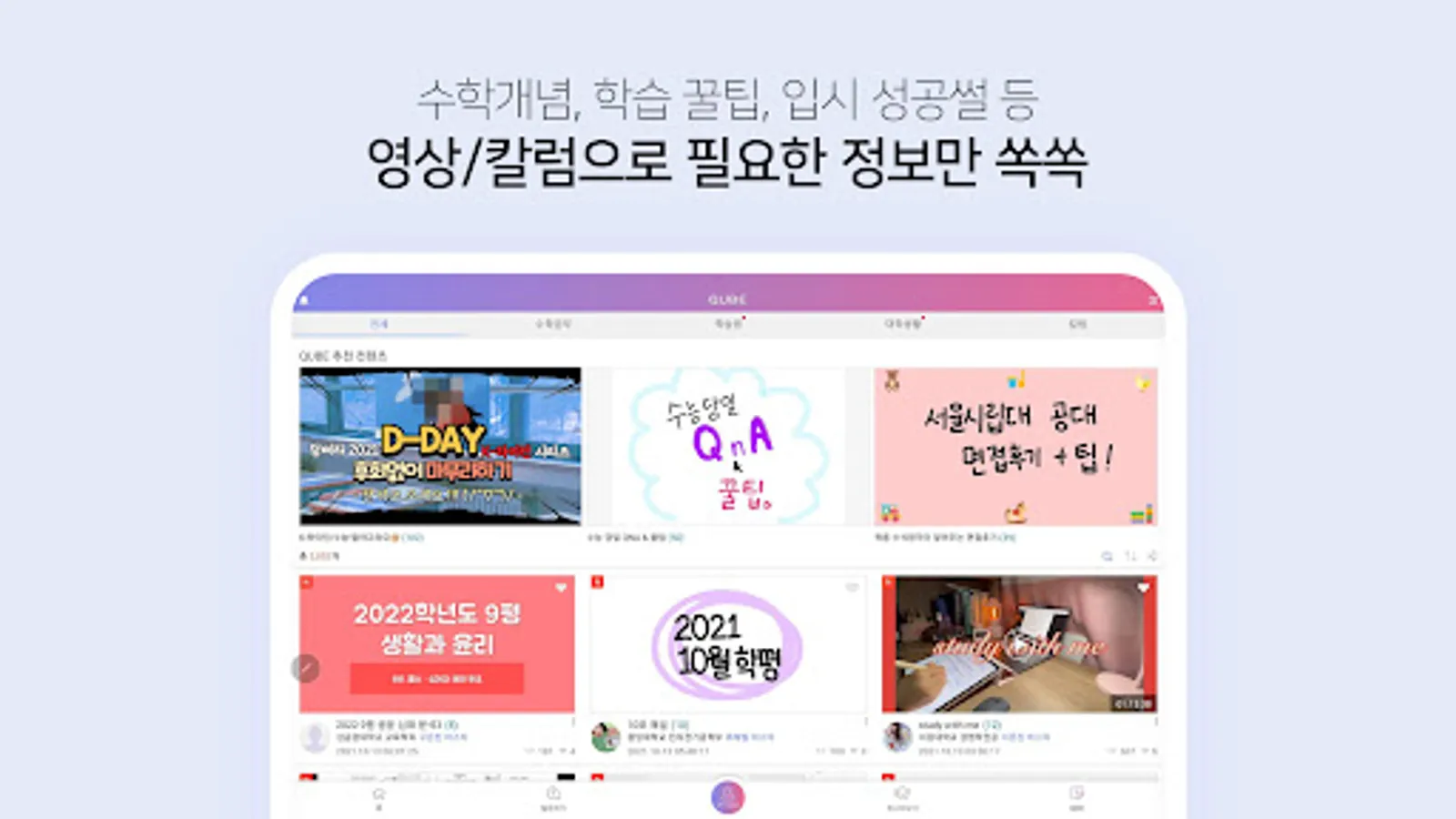 Mock test problem solving, 5-minute math concept summary, entrance exam success, learning know-how, and even a glimpse of vivid college life! Get various tips in the learning & healing space for high school students only.