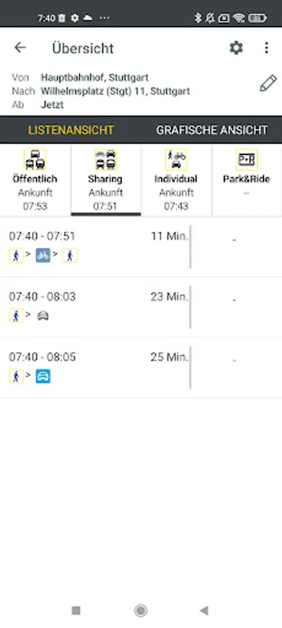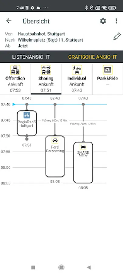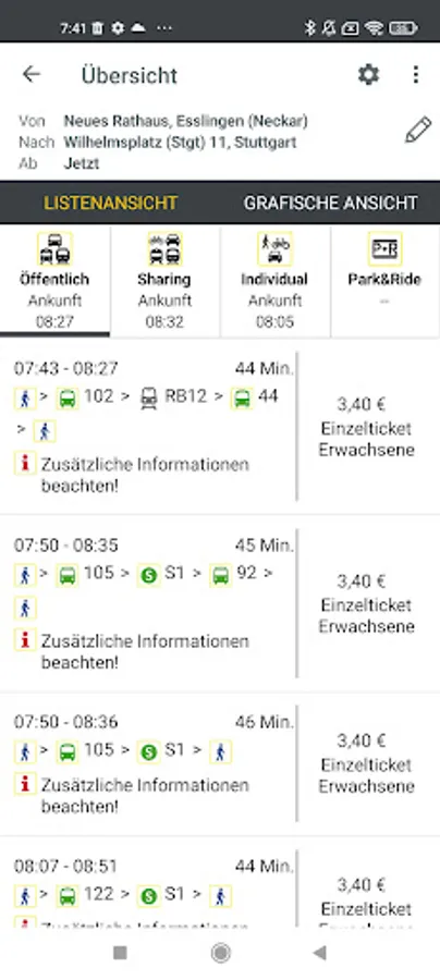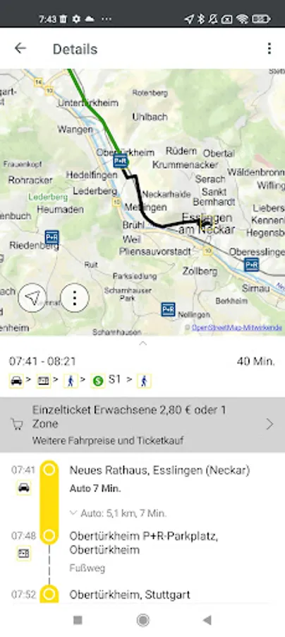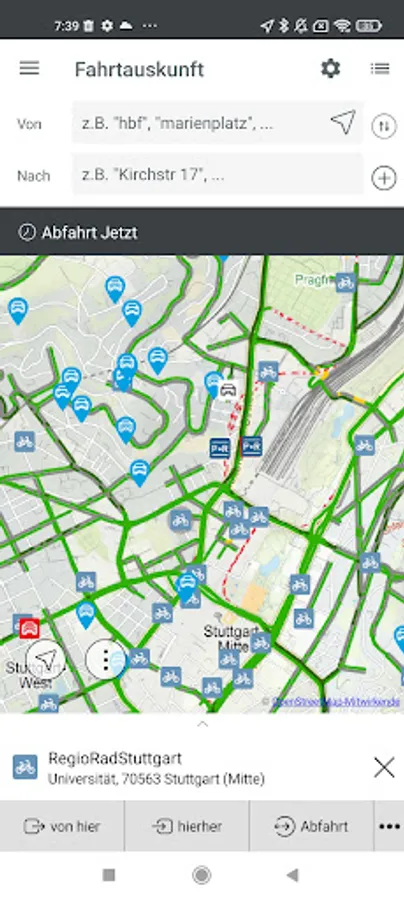 The mobile, multimodal real-time timetable information for buses and trains shows the user the best connections, alternative routes, disruptions and delays as well as nearby stops, P&R parking spaces and sharing vehicles.