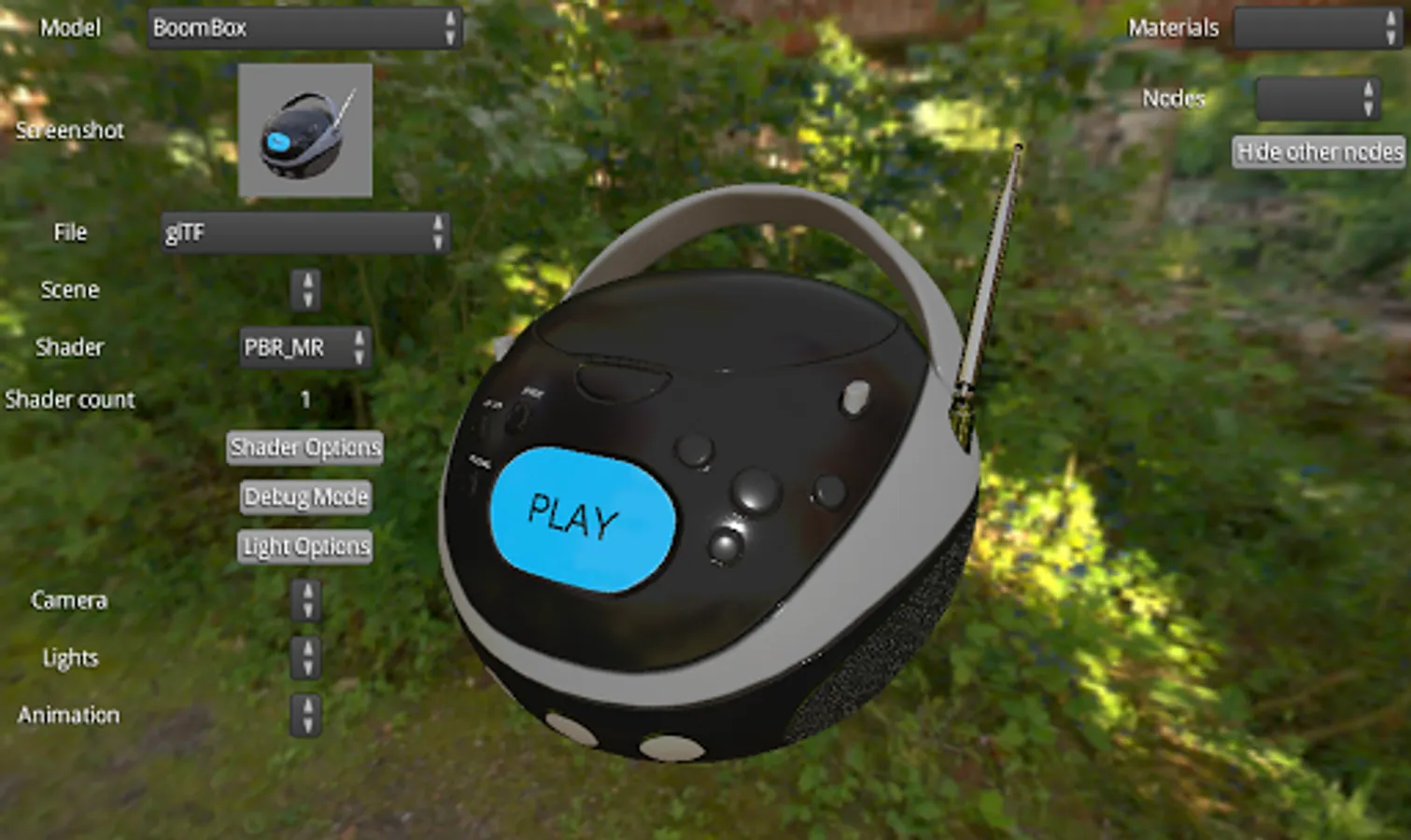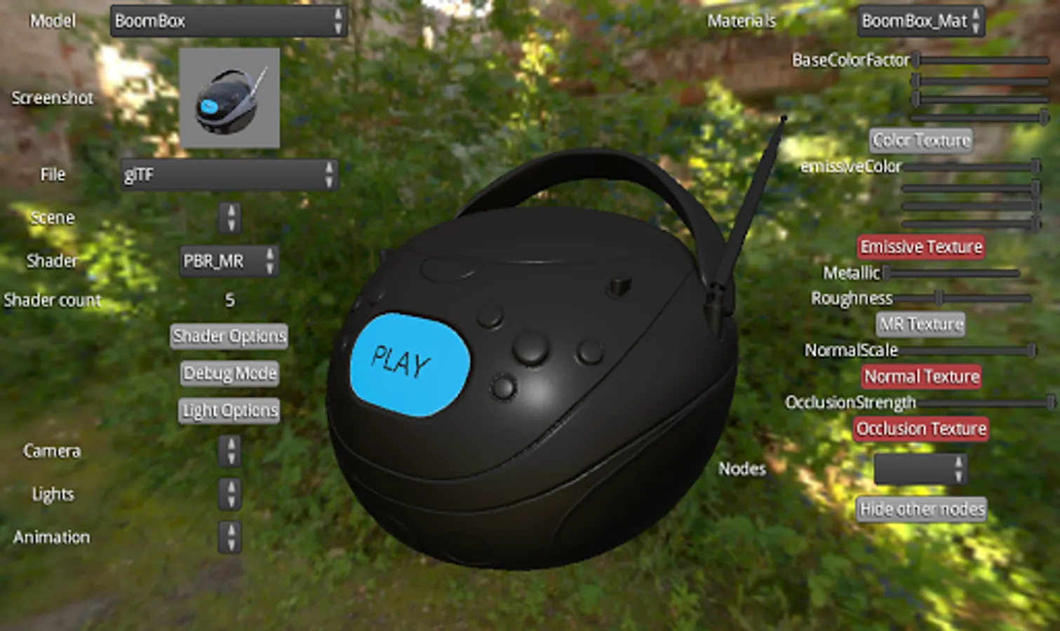 It's shipped with an official model and a custom one. It allows to play with these models : changing material parameters, play animations and more.