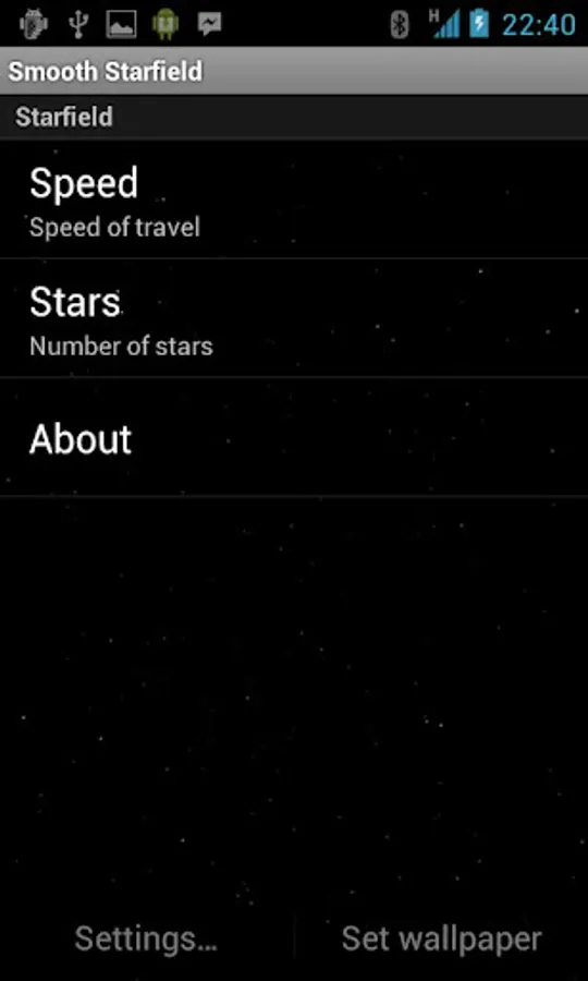 A smooth and realistic looking starfield, inspired by the ones found in cracktros and demos during the 16 bit era. (Amiga 500/Atari ST) I tried a lot of different starfield live wallpapers on Play, but couldn't find one that was smooth and looked like I wanted, so I made my own.