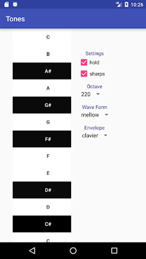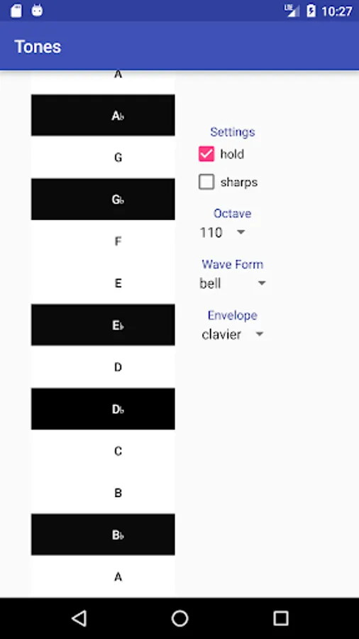 The interface is plain but straightforward, similar to a piano keyboard layout. Display can be either sharps or flats. The user can select from a variety of tones (sine, square, PWM, &c) and envelopes (organ, clavier, or fade-in/out).