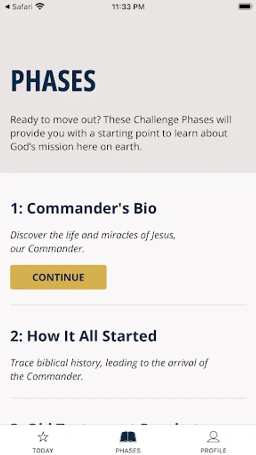 Each devotional challenge is a multi-day set of daily Scripture readings which leads the user through a specific topic or portion of the Bible designed to support active military personnel, veterans, and their families