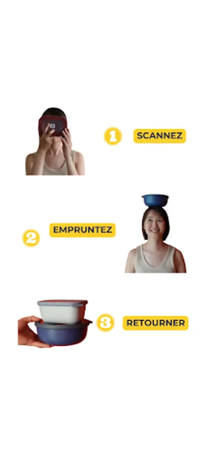 We have therefore designed an innovative digital solution that aims to replace these disposable packaging with reusable containers. Concretely, we provide reusable food boxes, digitized with QR codes, to partner restaurants. These boxes are then offered free of charge to customers who use our Minja app to take their food away. Customers can then return the boxes to one of the many Minja collection points, where they are cleaned and reused for new meals.