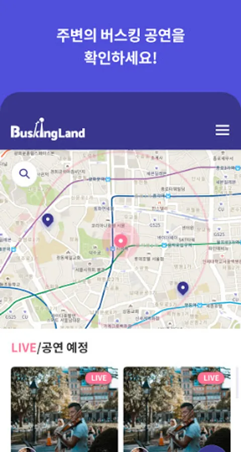 앱을 켜면 주변 5km 이내의 버스킹 장소를 볼 수 있어요.