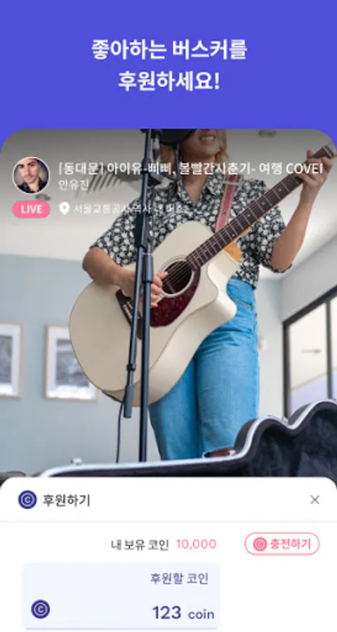 라이브로 버스킹을 즐기면서 코인을 후원할 수 있어요.