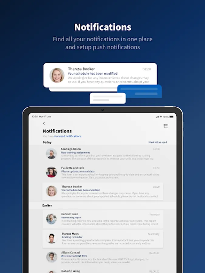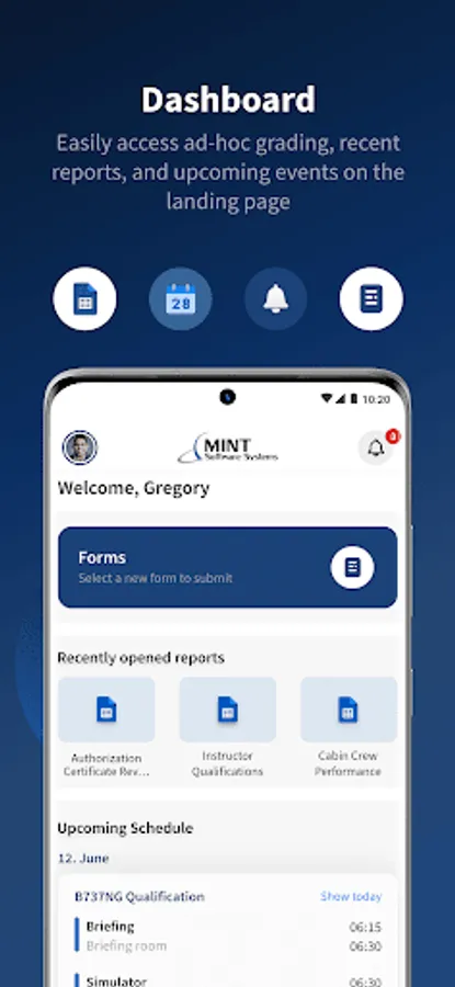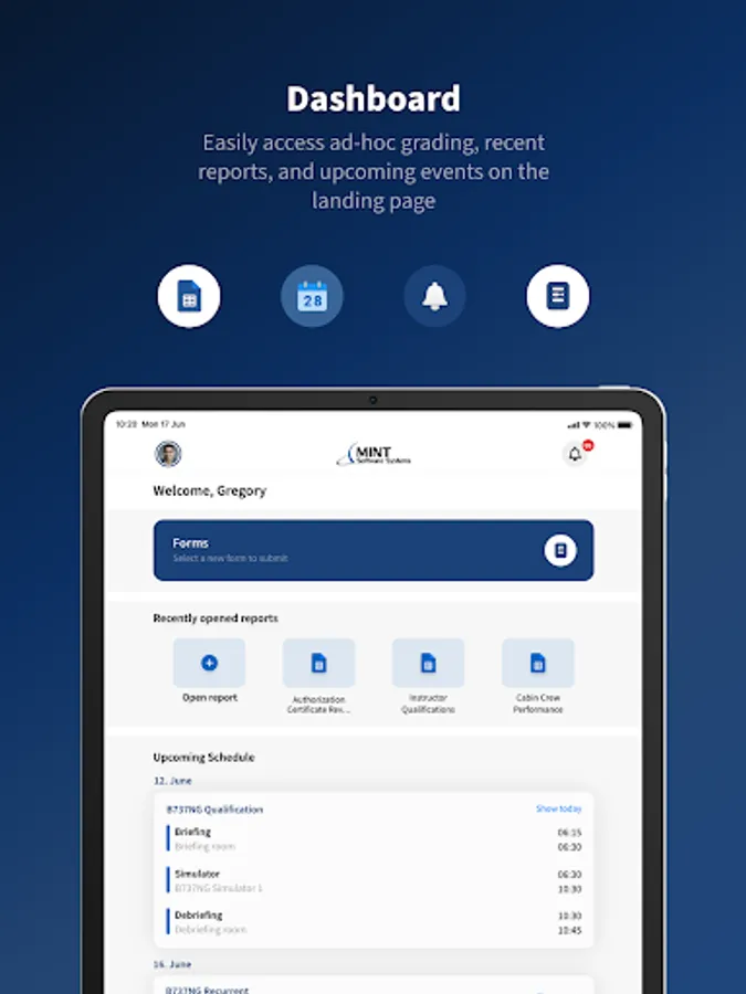 MINT TMS app is the on-the-go connection to the MINT Training Management System, MINT TMS. The app allows you to quickly and easily access up-to-date schedule info, complete forms (online or offline), visualize reports on MINT data, and display automatic notifications.