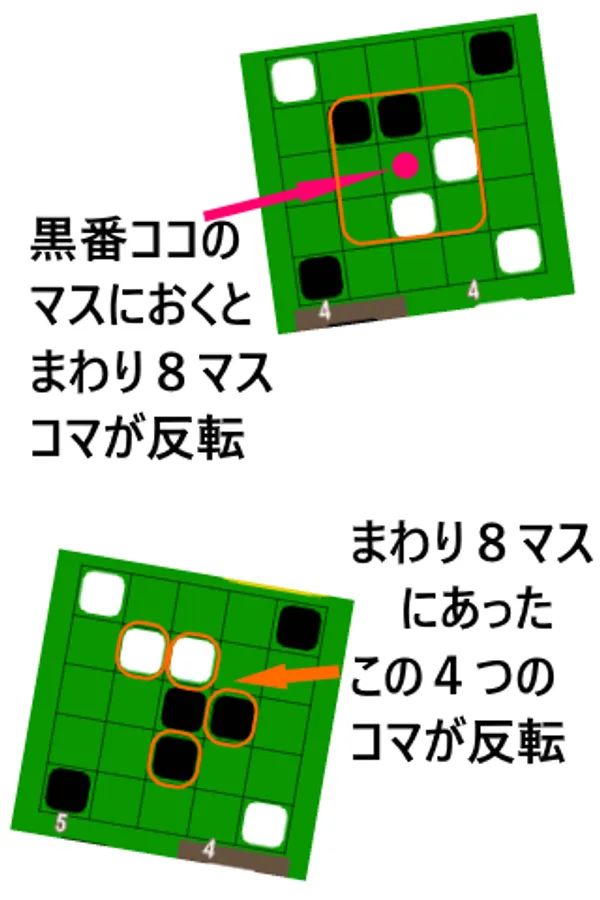 置いたマスの周り8マスにあるコマをひっくり返す。(相手のコマも自分のコマも)