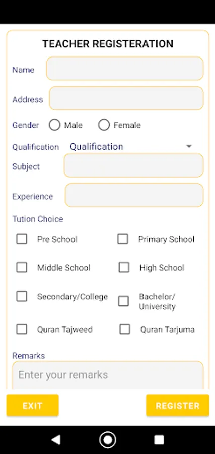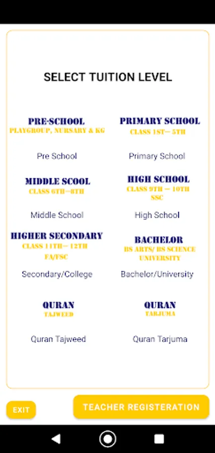 This App is developed to solve The problem of finding suitable Teacher for student tuition, it will show all the teachers in the locality for specifice level of tuition to the student to contact registered teacher for tuition