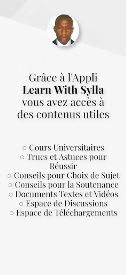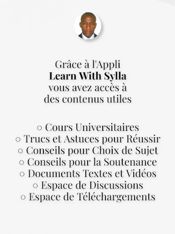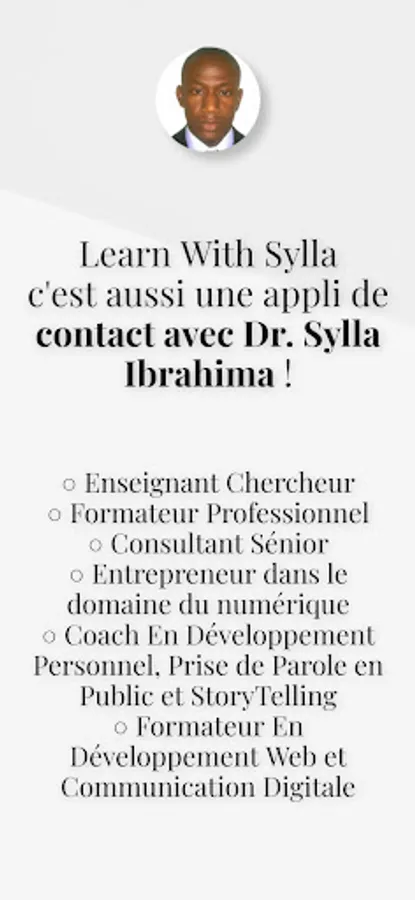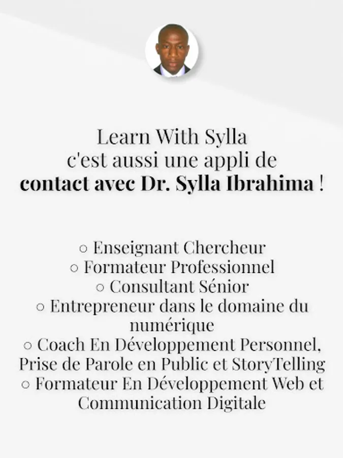 Learn With Sylla is an application that gives you access to all of Dr. Sylla Ibrahima's content and contacts.