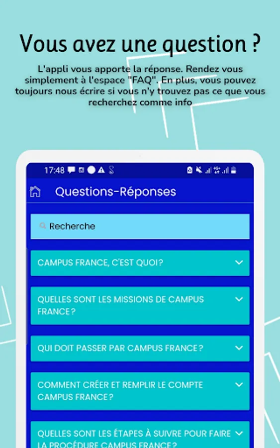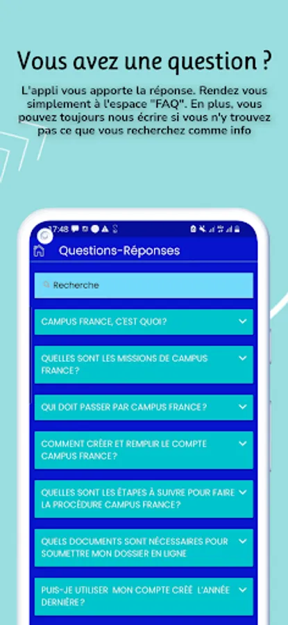 While answering these important questions, the application allows you to access a lot of resources: Access links to the different Campus France, Tutorials to carry out the procedures, Questions-Answers on Campus France, Tools for monitoring your approach under to-do format and Information document downloads area.