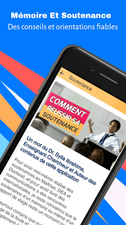 This application is intended for all students who wish to know how to complete their Master and pass their Defense. It is designed by the MobiApps Pro Agency on the basis of content that Dr. Ibrahima Sylla, Teacher Researcher and Professional Trainer, shares on his website.
