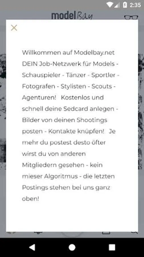 Welcome to Modelbay.net YOUR Job Network for Models - Actors - Dancers - Athletes - Photographers - Stylists - Scouts - Agencies! Create your sedcard for free and fast - post pictures of your shootings - socialize! The more you post the more often you will be seen by other members - not a lousy algorithm - the last postings are our top priority!