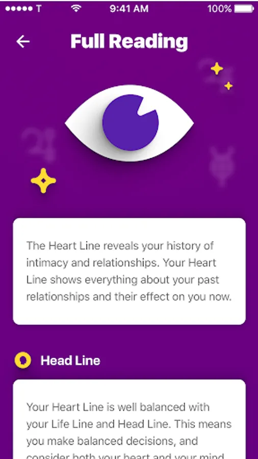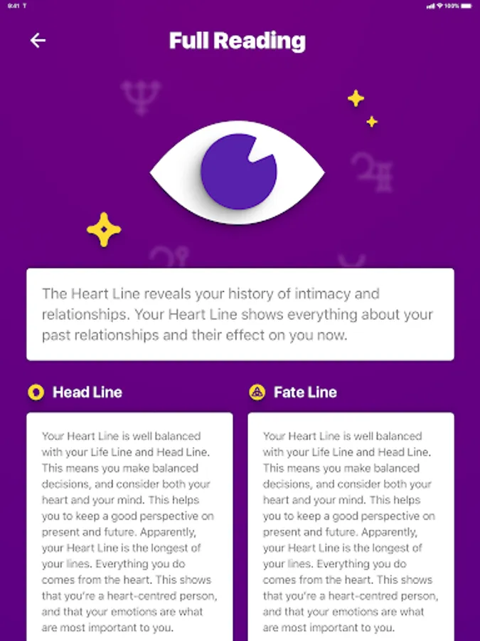 Reveal the life story written on your palm! Your palm lines contain a story about your personality, your traits and perceptions. Our palm reading app -- Palm Reader Insights Palmistry -- will help you reveal your hidden story. Palm Reader reads your palm to find and analyse your Heart Line, Life Line, Head Line, Fate Line and all the palm mounts. Get a free and personalised reading of your palm based on the ancient palm reading rules.