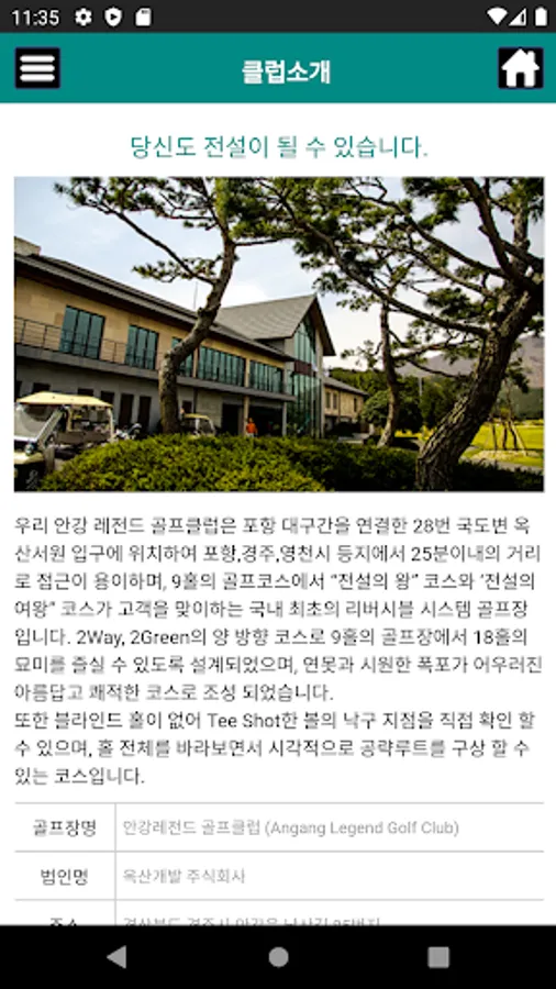 우리 안강 레전드 골프클럽은 포항 대구간을 연결한 28번 국도변 옥산서원 입구에 위치하여 포항,경주,영천시 등지에서 25분이내의 거리로 접근이 용이하며, 9홀의 골프코스에서 “전설의 왕” 코스와 ‘전설의 여왕” 코스가 고객을 맞이하는 국내 최초의 리버시블 시스템 골프장입니다. 2Way, 2Green의 양 방향 코스로 9홀의 골프장에서 18홀의 묘미를 즐실 수 있도록 설계되었으며, 연못과 시원한 폭포가 어우러진 아름답고 쾌적한 코스로 조성 되었습니다.
