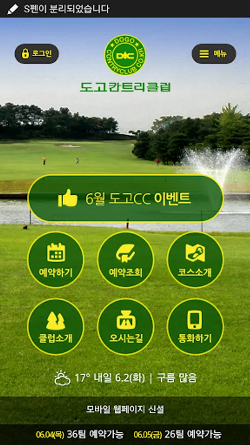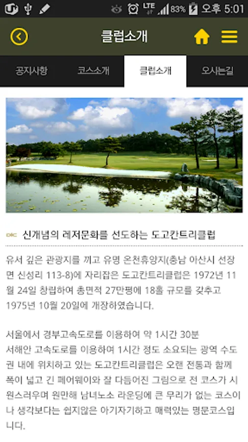 The Dogo Kantry Club was established on November 24, 1972 in the famous hot spring resort (113-8 Shinseong-ri, Seonjang-myeon, Asan-si, Chungcheongnam-do) with historic sightseeing spots. It was opened on October 20, 1975 with an area of 270,000 pyeong I did.