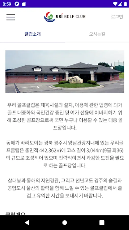 Woori Golf Club, located in Yangnam Tourist Site in Gyeongju, Gyeongbuk, overlooking the East Sea, has a total area of 442,362㎡ and a course length of 3,044m (9 holes, par 36).