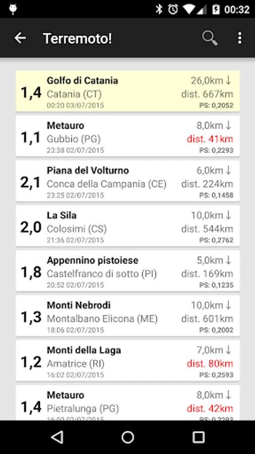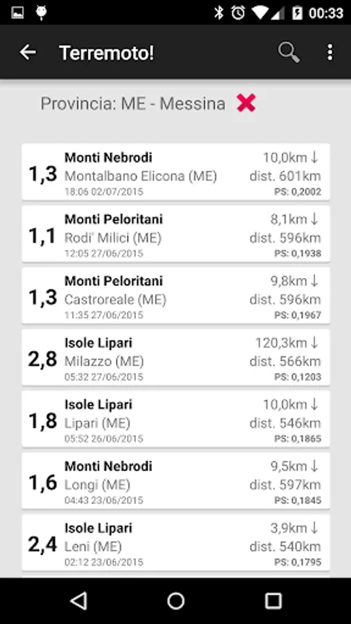 When a search is performed, by typing two characters the program will search for all the seismic events occurred in the corresponding province, while for any other text a FREE search will be performed on the name of the municipality or on the name of the seismic survey zone. In case of search, the filters will be deactivated based on the distance and / or magnitude of the event.