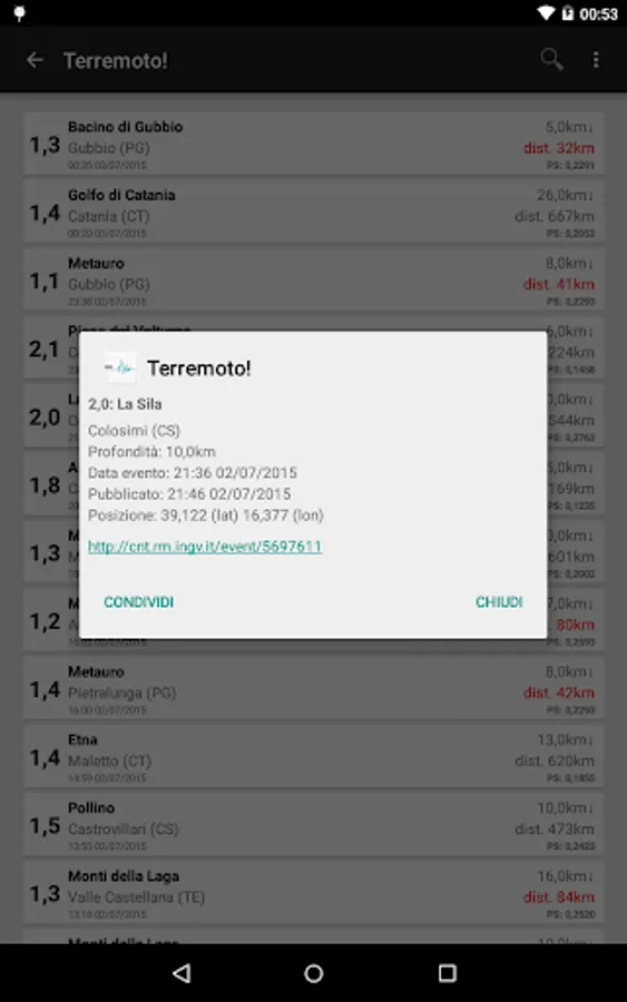 Remember that the INGV publishes the new seismic events with an average delay of 20/30 minutes, so it means that when an earthquake occurs on the site of the INGV this will be inserted ONLY after being checked by seismologists and then only after the publication will be notified to your devices!