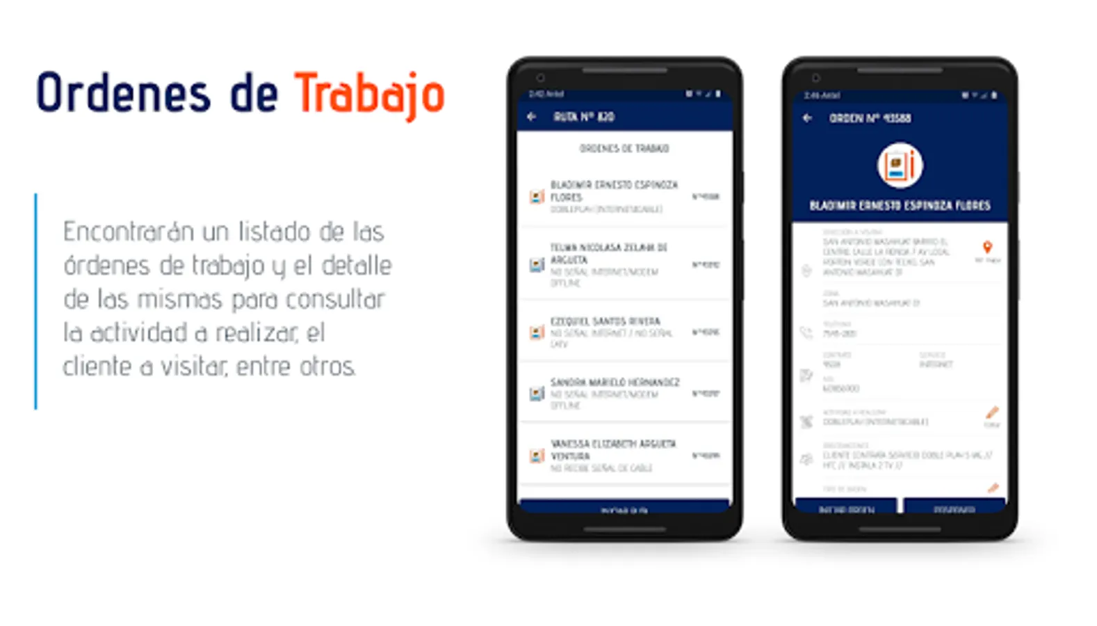 Each route is made up of Work Orders which must be fulfilled on the specified date or left pending for a later date specifying the reason for said movement. Integration with maps integrating the positioning of each client. Monitoring of effective times and Quality control.