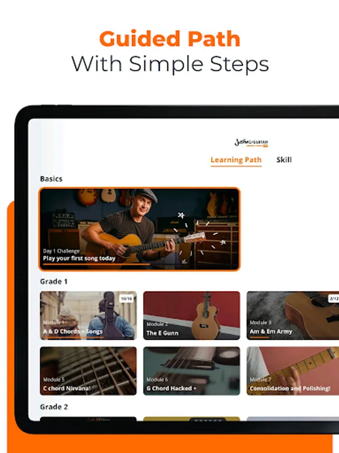 In Justin Guitar App, the Daily Practice Routine combines all essential exercises for each module into a fun & effective 10-min routine that you can repeat daily until you're ready to progress to the next module.