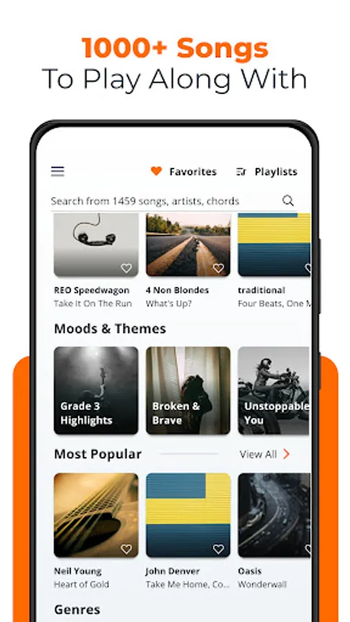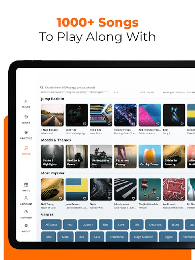 Practice your guitar chords and play along with pop, rock, and country songs. As one of the best ways to learn guitar, our interactive song player is specially designed for beginners with great features such as slowing down tempo or backing lyrics and guitar chords display.